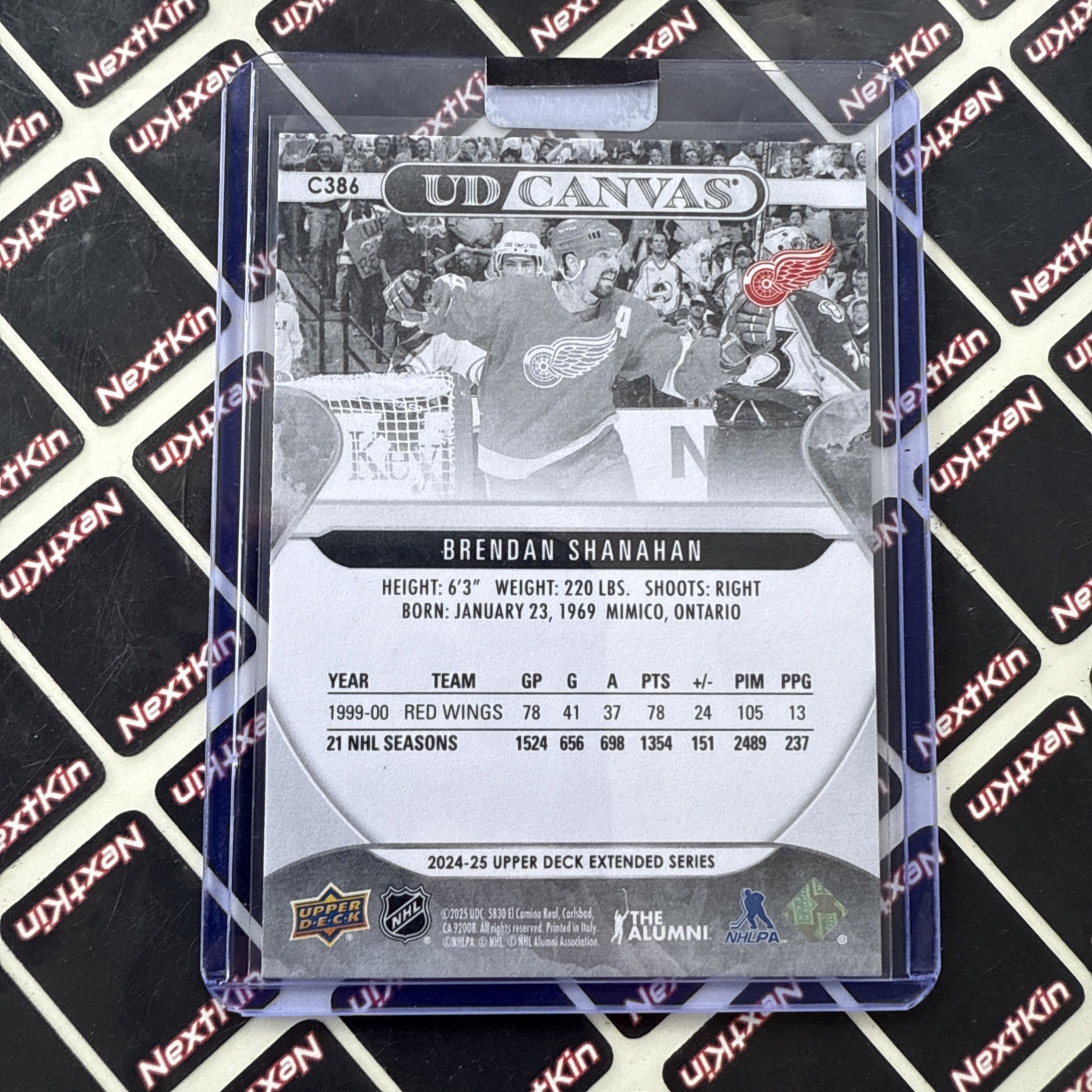 Capture a piece of ice hockey history with the 2024-25 UD Extended Brendan Shanahan Canvas Black & White Retired Stars #C386 trading card. Celebrate the legacy of Brendan Shanahan, a revered figure in the NHL and a beloved member of the Detroit Red Wings, with this exquisite addition to your collection. This card, part of the highly sought-after 2024 Upper Deck set, showcases the Black & White parallel variety, adding a unique touch to its design. Proudly presenting the craftsmanship of Upper Deck, this sports trading card is a must-have for enthusiasts and collectors. The CANVAS feature ensures a premium feel, while the card's attributes, including the Retired Stars series, make it a standout piece. With no autograph, the focus remains solely on the card's striking appearance and the athlete it honors. Add this piece of sports memorabilia to your collection and own a snapshot of Brendan Shanahan's illustrious career.