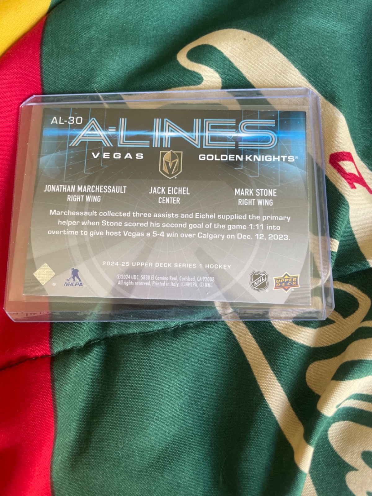 Card Number:AL-30Parallel/Variety:[Base]Team:Vegas Golden KnightsInsert Set:A-LinesSeries:Upper Deck Series 1Manufacturer:Upper DeckPlayer/Athlete:Jack Eichel, Jonathan Marchessault, Mark Stonebrand:Upper DeckSeason:2024-25Sport:Ice HockeyFeatures:InsertSet:2024-25 Upper Deck Series 1League:National Hockey League (NHL)