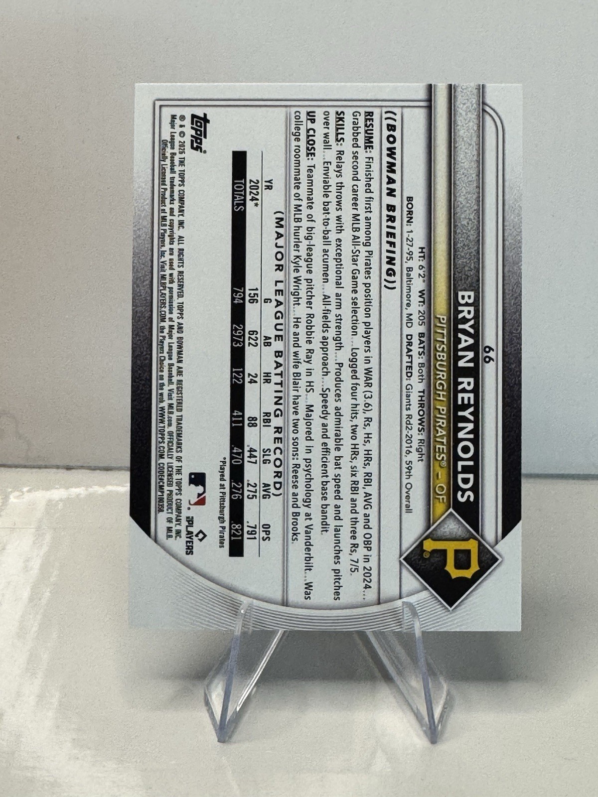 Card Number: 66 Features: Serial Numbered, Base Set, Parallel/Variety Print Run: 125 League: Major League Baseball (MLB) Set: 2025 Bowman brand: Topps Parallel/Variety: Blue Pattern Season: 2025 Player/Athlete: Bryan Reynolds Team: Pittsburgh Pirates Sport: Baseball Series: Bowman Manufacturer: Topps