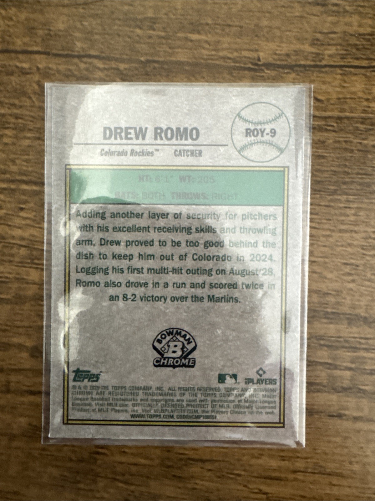 The product is a 2025 Bowman Chrome Drew Romo #ROY-9 Rookie Of The Year Favorites insert card featuring a misprint error. This standard-sized trading card is part of the Major League Baseball set and represents the Rookie Of The Year Favorites insert series. It is a Chrome Refractor parallel variety with a 35 pt. card thickness, making it a valuable addition to any baseball card collection. The error adds a unique element to the card, making it a sought-after item for collectors looking for rare and mint condition sports trading cards.