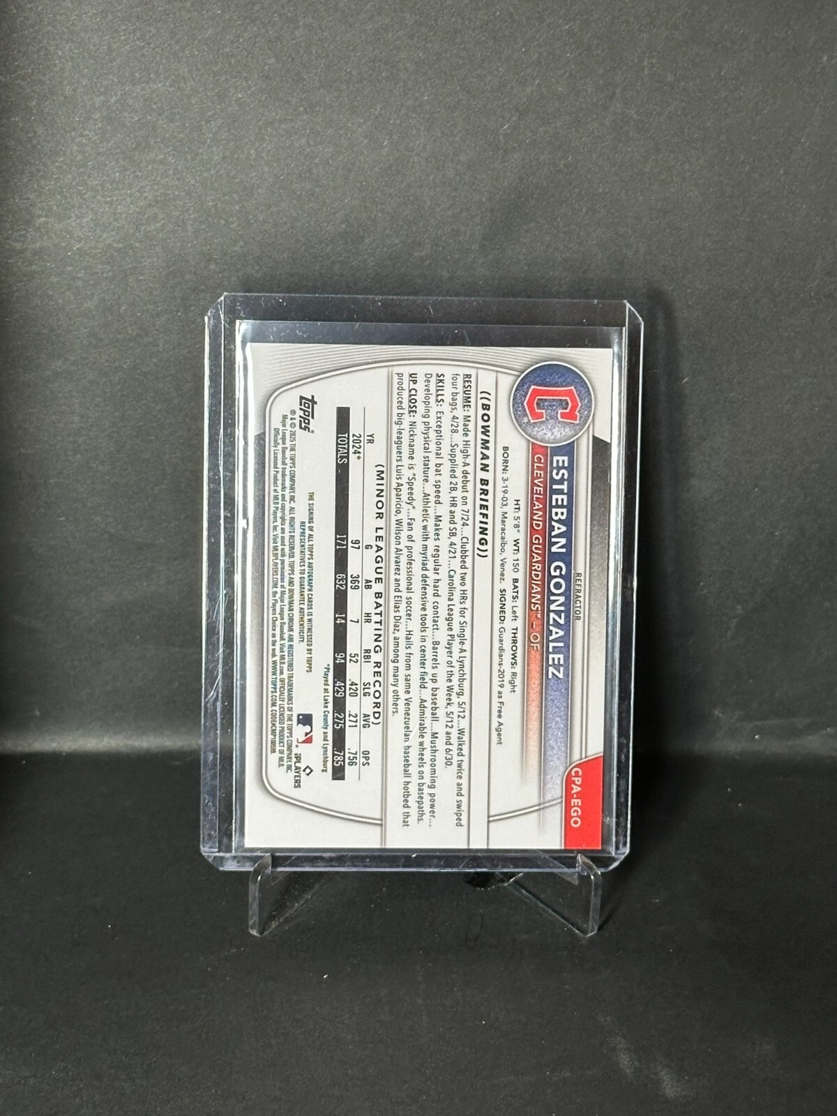 The product is a 2025 Bowman Chrome Prospect Auto Esteban Gonzalez trading card featuring a Refractor parallel with a limited print run of 499. It is a Major League Baseball (MLB) sports trading card manufactured by Topps, part of the Chrome Prospect Autographs insert set. The card is numbered CPA-EGO and belongs to the Cleveland Guardians team. It is a rookie card from the 2025 season, making it a highly sought-after collectible for baseball card enthusiasts.