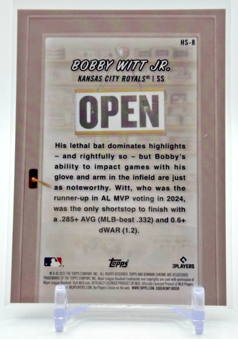 The product is a 2025 Bowman Chrome Hobby Stars Gold Refractor trading card of Bobby Witt Jr. from the Kansas City Royals. This card is a limited print run of only 50 copies and features a serial number, making it a highly sought-after collectible for baseball fans and card collectors. With its exclusive design and rarity, this original Topps card showcases the talented player in a unique and eye-catching way, perfect for any baseball card collection.