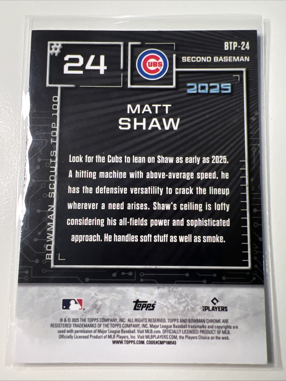 The product is a 2025 Bowman Matt Shaw Chrome Bowman Scouts’ Top 100 Insert #BTP-24 trading card featuring the player Matt Shaw from the Chicago Cubs. It is a standard-sized baseball card from the Major League Baseball (MLB) set 2025 Bowman Baseball. The card is an original insert in English language, part of the Bowman Scouts’ Top 100 Insert set by manufacturer Topps. It is a rookie insert card, not autographed, and is a parallel/variety within the Bowman Scouts’ Top 100 Insert series.
