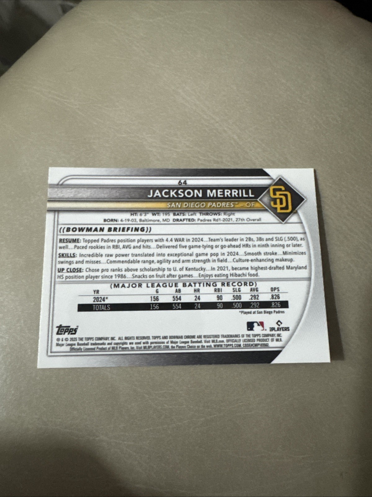 This card is a must-have for any serious collector! The Mojo Refractor finish makes Jackson Merrill’s rookie card pop with vibrant colors and sharp details. As a short print parallel, it’s a rare find that adds serious value to any MLB collection. The quality is top-notch, and the Padres’ rising star makes it even more special. A fantastic addition for fans and investors alike!