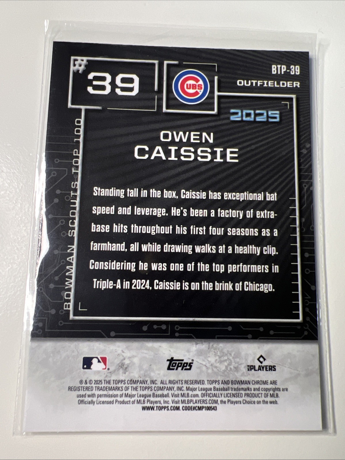 The product is a 2025 Bowman Scouts Top 100 trading card featuring Owen Caissie of the Chicago Cubs. Manufactured by Topps, the card is part of the Bowman Scouts Top 100 insert set, made of standard baseball card stock with a thickness of 35 Pt. It is an original, English-language card with a refractor parallel/variety, perfect for collectors looking to add a unique piece to their sports trading card collection.