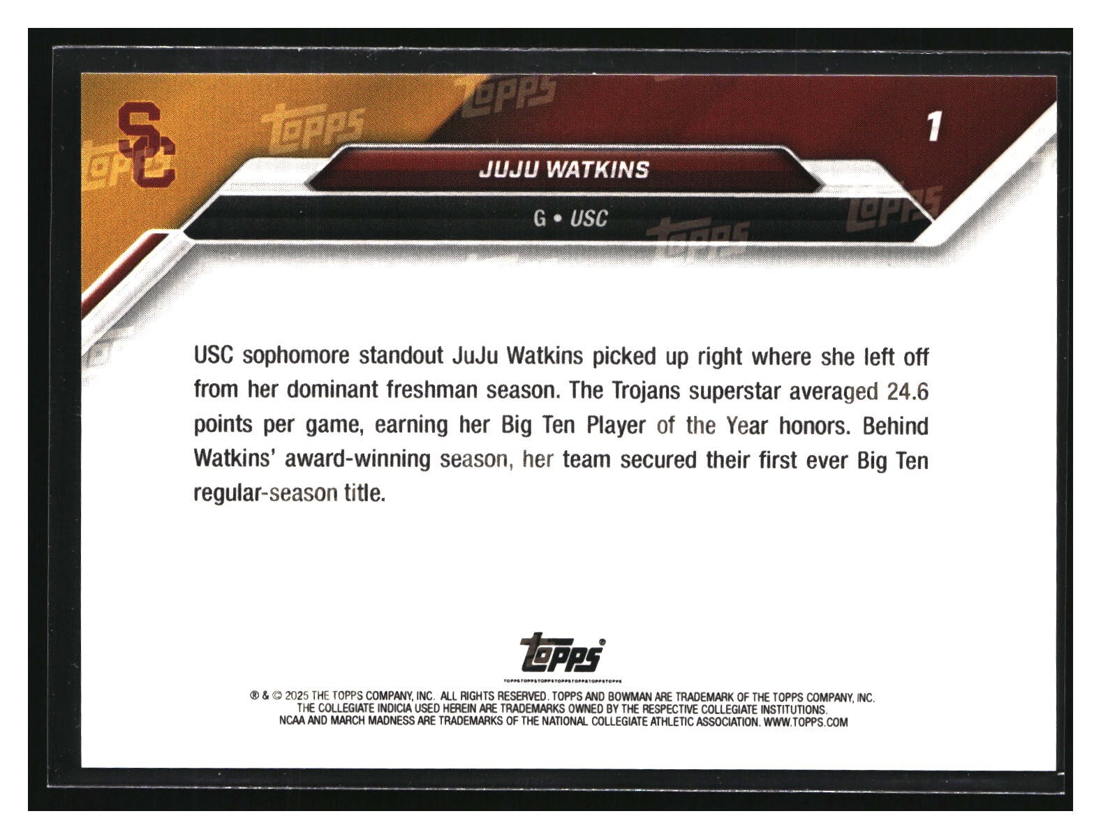 2025 Bowman U Now NCAA March Madness #1 Juju Watkins USC Trojans