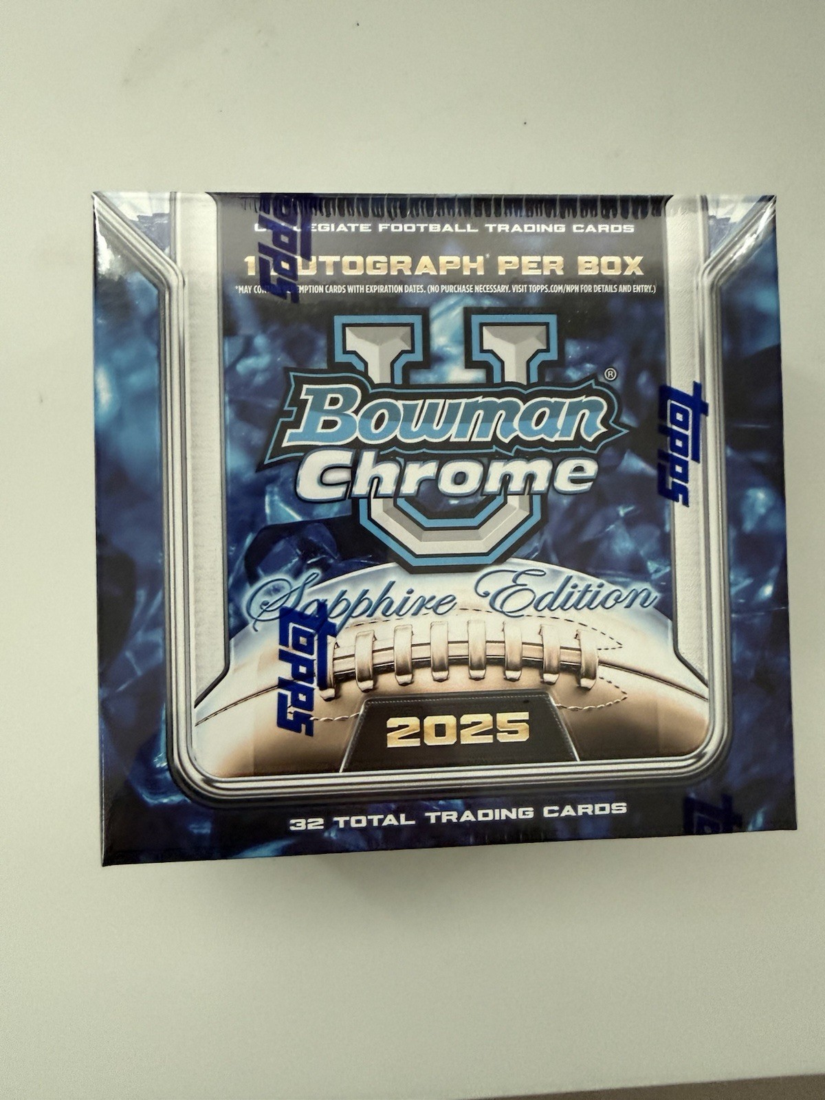 The 2025 Bowman University Chrome Football Sapphire Edition Hobby Box is a limited edition sports trading card set featuring football players. Manufactured by Bowman, this box contains sealed trading card packs from the 2025 season. With a sleek chrome finish and a special Sapphire Edition design, this product is a must-have for any football card collector looking to add a unique and valuable set to their collection.