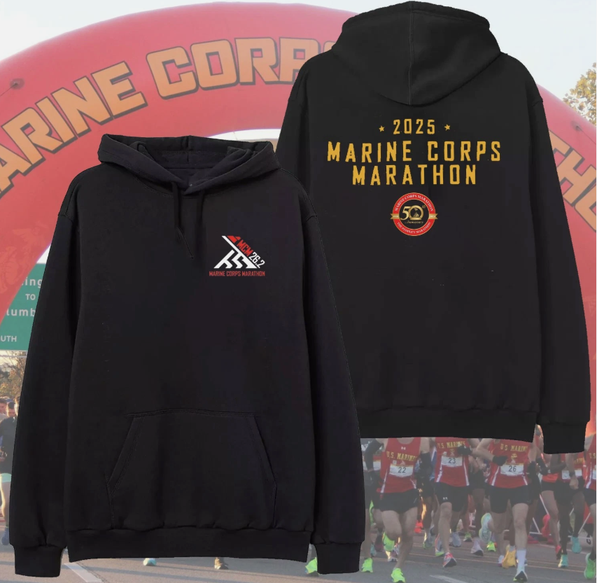 ⭐ Product Description – 2025 Marine Corps Marathon Hoodie (50th Anniversary Edition) ⭐ Celebrate the 2025 Marine Corps Marathon with this special-edition hoodie, designed to honor one of the most iconic races in the United States. Featuring bold front and back graphics, this hoodie is perfect for runners, collectors, supporters, or anyone who wants a memorable keepsake from the event’s 50th Anniversary . Key Features: Color: Black Front Design: 2025 Marine Corps Marathon logo Clean, athletic race-style graphic Back Design: Large “2025 Marine Corps Marathon” print Official 50th Anniversary emblem Material: Soft cotton/poly blend (depending on manufacturer) Style: Classic pullover hoodie Kangaroo Pocket: Spacious front pocket Fit: Standard unisex fit, comfortable for everyday wear Ideal For: Runners, marathon fans, collectors, military supporters Care Instructions: Machine washable, easy maintenance ⭐ Why Buyers Love It: Special 50th Anniversary edition High-quality print on both front and back Comfortable and warm for casual wear or race-day events Great collectible item for the 2025 marathon 📦 Shipping Information (USA Only) Handling Time: 5 business days Estimated Delivery: 5–7 business days Ships via USPS/UPS Tracking number will be uploaded after shipment.