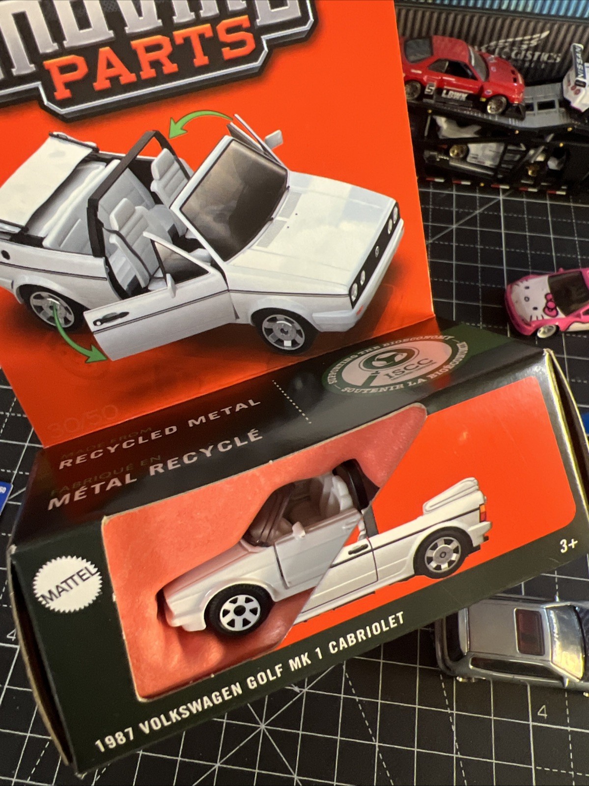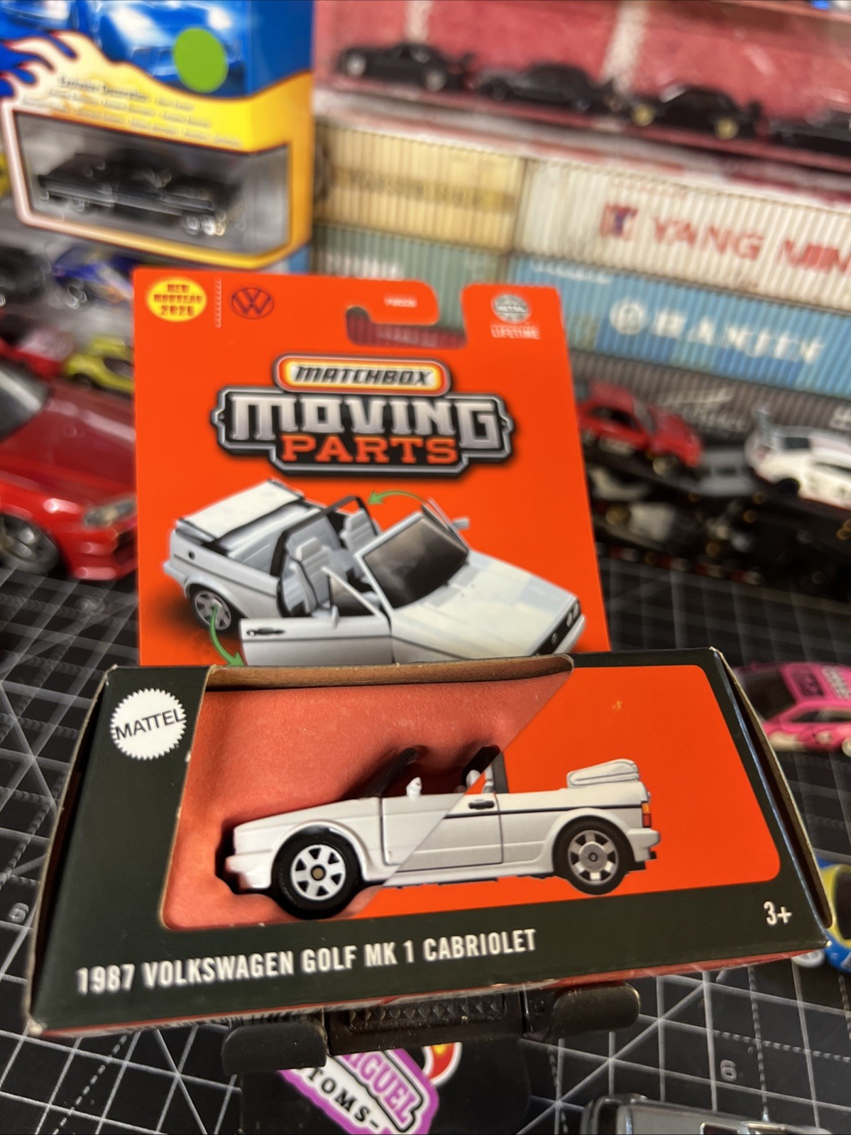 The product is a 2025 Matchbox Moving Parts model of the 1987 VW Golf MK1 Cabriolet in white color. This diecast toy vehicle is part of the contemporary manufacture series and features opening doors, making it a realistic and interactive toy for children and collectors. The 1:64 scale model is a classic 80s English car, perfect for fans of German vehicles and vintage automobiles.