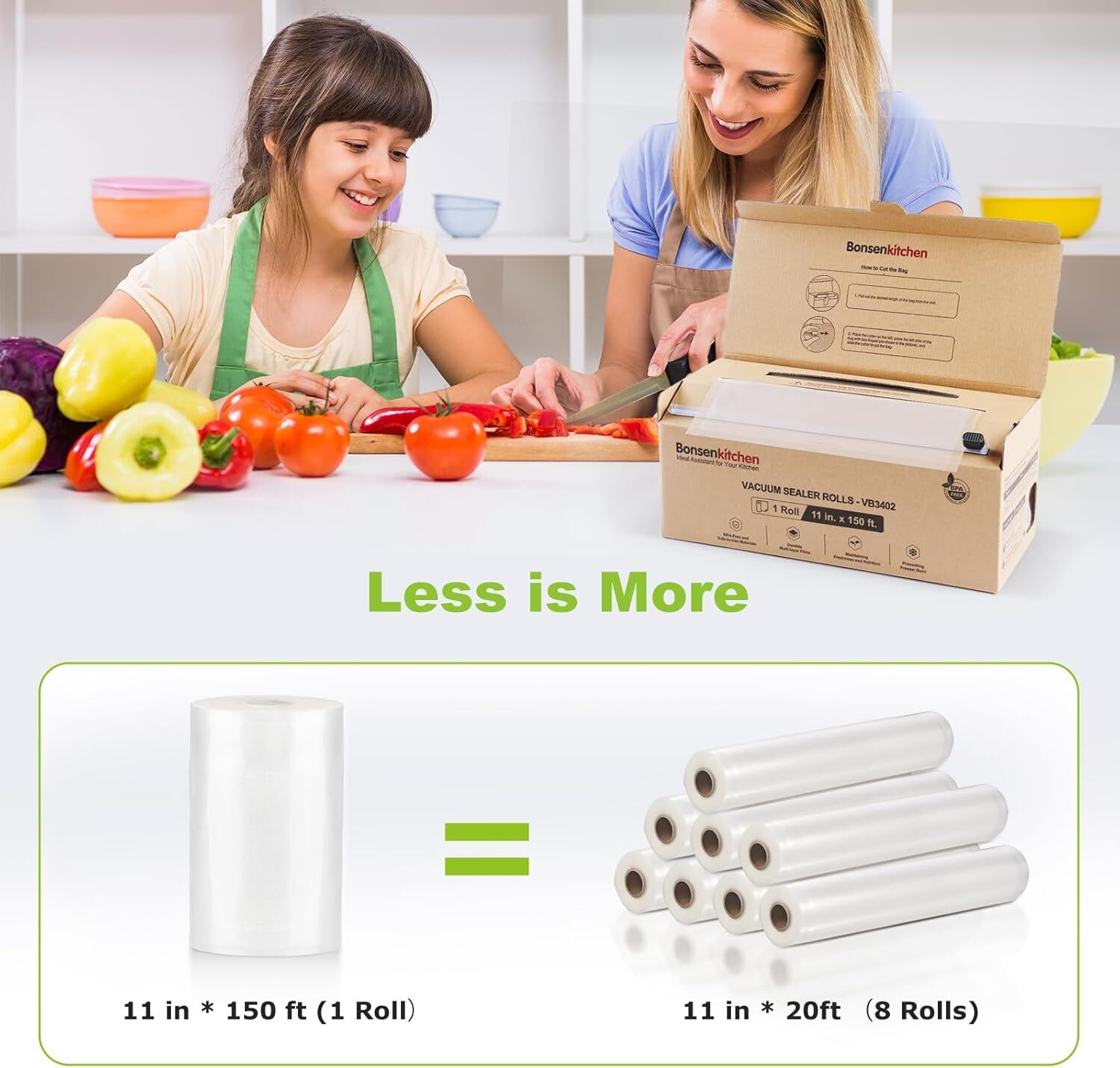Custom Length Convenience: With a built-in cutter, the Bonsenkitchen vacuum sealer roll keeper lets you easily create the desired length for your vacuum bags Clean and Tidy Storage: The dust-proof cutter box ensures your vacuum sealing bags stay clean and tidy. Includes 1 roll of 11 inches by 150 feet BPA Free Safety and Commercial Grade Quality: Safe for microwave, refrigerator, dishwasher, and sous vide cooking, our commercial-grade bags feature deeper air channels and superior sealing Extended Shelf Life: Extend food storage time by 3-6 times, locking in freshness, flavor, and nutrients. These bags also prevent punctures and freezer burn Universal Compatibility: Compatible with all major vacuum sealer brands, these bags help you pack food in bulk and save space Product Description Some Tips to Use Vacuum Seal Roll Keeper Bonsenkitchen Food Vacuum Sealer Roll Bags Less is More Our 150-foot roll bag provides more bags than 8 traditional food storage rolls, ensuring you have more than enough to tackle your daily vacuum sealing tasks. Built-in Cutter, Precise to Cut With a cutter on the keeper, there is no need for scissors, just pull out the vacuum seal roll to the size you need and cut, more precise, and no more waste. Is the cutter sharp enough to provide clean cuts? Yes, the Bonsenkitchen vacuum sealer roll bags have a built-in cutter that provides clean, precise cuts every time. It allows you to create custom-length bags easily, reducing waste and enhancing convenience. No scissors needed! Do they prevent freezer burn effectively? Yes, Bonsenkitchen vacuum bags prevent freezer burn effectively. With deeper air channels and superior sealing technology, they remove air and create a tight seal to maximize freshness and protect food from freezer burn. Do they contain any harmful chemicals or materials? No, Bonsenkitchen vacuum bags are made from high-quality, food-grade, BPA-free materials. They are safe for microwaves, refrigerators, dishwashers, and sous vide cooking up to 230°F/110°C. Safety and sustainability are prioritized. Are they suitable for storing liquids or soups? Yes, Bonsenkitchen vacuum bags are also designed for liquids and soups. They are leak-proof and can handle high-moisture foods, ensuring secure containment and preventing spills while maintaining freshness. Does the bag retain its vacuum seal over time? Absolutely! Bonsenkitchen vacuum bags use superior sealing technology to maintain vacuum integrity for extended periods. They keep food fresh and nutritious, lasting up to 3-6 times longer than traditional storage methods.