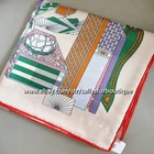Scarf Care: Please hand wash the silk scarf in cold water, using gentle silk/wool wash. Do not wring. Gently squeeze the water, and dry in the shade. Iron on a low silk setting. Please do not machine wash. Item description: Size: 35 inches x 35 inches (90cm x 90cm) Material: 100% Twill silk, Weight: 62g Double face in the same colors. Hand rolled on the 4 edges, so the size could be 1 inch difference. Made in China, no brand label.
