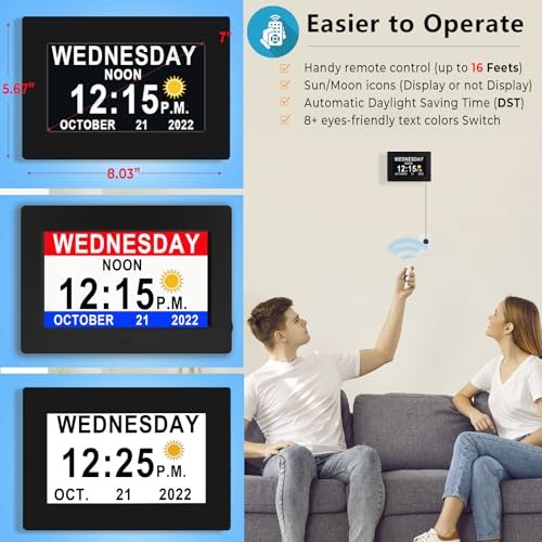 Return Policy Fast Delivery Trusted seller 【2025 New】19 Alarms Digital Clock with Voice Talking Time, Auto DST, 20 Custom Reminders, 10-Level Dimmer, Sleep Trainer, Day Date Calendar Clock for Seniors Dementia Alzheimers'- 7 Inch with Remote Product Description ???? ???????? ?? ??????? & ?????-??????? ???? ????: upgraded 7" large 1280*800HD digital clock clearly displays Time, Day of Week and Date, no confusing comma on date. Additionally, You can also hear the real-time date announcement with the unique voice feature. Backup with ???????? ??????? ??? ?????? ????????, no battery changes, much safer and more convenient to use for dementia seniors, office work, or school-age kids ???????? ????? ???? ???? ????????: Soft light, without blue light, not hurts eyes. You can choose non-abbreviated or abbreviated day date themes, configurable Sun☀Moon? icons. calendar day clock uses the minimalist design, all adjustments can be completed with 4 direction buttons, OK and MENU/ SETUP buttons. The button control + remote control will ensure the clock is frustration-free operation on the wall or at a distance ???????? ?????? & ??+ ?????? ?????????: never miss a special event or task again! This digital clock with day and date comes with multiple reminders for medications and drinking water; More uniquely, You can also add, edit or upload 20+ reminders for a daily, weekly or even a date-specific schedule ?????-???????? ?????????????: Instead of fixed dimming at 7pm or 8pm, our clock allows you to select the time points to dim automatically align with your night bedtime routine. The night sleep trainer signals when it's time to wind down, great for the memory loss seniors or young kids to develop healthy sleep patterns ???? ??? ?????????? & ? ????? ??????: no need to manually spring forward or fall back, clock has automatic DST adjustment in March and November. You can turn off DST manually if you don't need. 7 cycles include MORNING, NOON,AFTERNOON, EVENING, NIGHT, MIDNIGHT, PREDAWN. Custom the time of morning brightening and night dimming as needed +??? ??????????? ???????? & ????? ???? ?????: clocks are with Certified Safety Adaptor and Remote Control included, No need to buy seperately ! With instant plug-and-play, Large AM/PM and More than 8 colors of font combination relieves your reading difficulty ***The clock is powered by plugging in the outlet *** ???????? ???????? & ???????? ???????- No worry for quality issues, at you enjoy 365-Days warrenty and replacement ! clocks have more customizable options than the other day clocks, and we regularly update new features to suit your need. Shipping Returns Payment Shipping Shipping is FREE to all addresses other than APO/PO boxes in the lower 48 states. All our stock ships from US-based warehouses. Shipped via USPS or UPS (depending on location and package weight) Unless stated otherwise, all orders will ship within 24-72 hours of your payment being processed. Check our feedback to see the great reviews of FAST shipping we offer. Returns Seller does not accept returns Payment We currently accept payment via eBay managed payments only. Once payment is cleared, we will dispatch your shipment within 1-3 business days. Please refer to the "Shipping" tab for more information regarding shipping speed to your destination.