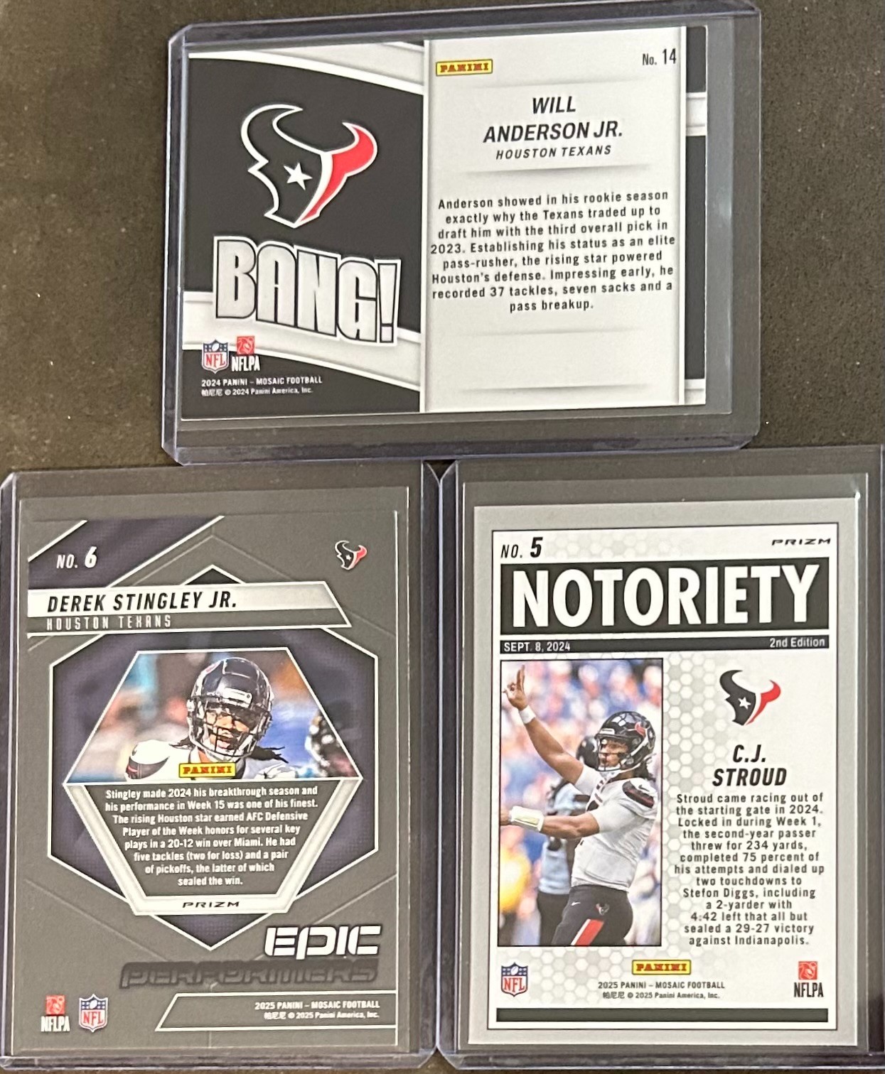 2025 Panini Mosaic Football 3 card insert/parallel trading lot for the Houston Texans! The cards are: 2025 Mosaic C.J. Stroud #5 Notoriety Insert, Mosaic Orange Fluorescent Parallel 2025 Mosaic Derek Stingley Jr. #6 Epic Performers Insert, Mosaic Orange Fluorescent Parallel 2025 Mosaic Will Anderson Jr. #14 BANG! Insert