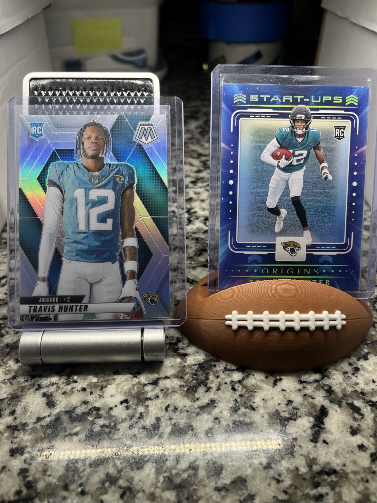 The product is a 4-card lot of rookie trading cards featuring Travis Hunter from the Jacksonville Jaguars, manufactured by Panini in 2025. These standard-sized cards are made of card stock and are original, not a reprint. Including, mosaic silver variations , origins start up, mosaic carbon copy & phoenix silver thunderbirds . The cards represent the National Football League (NFL) and are part of the 2025 season, making them a valuable addition for football card collectors and fans of Travis Hunter.
