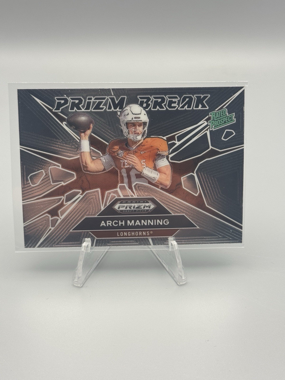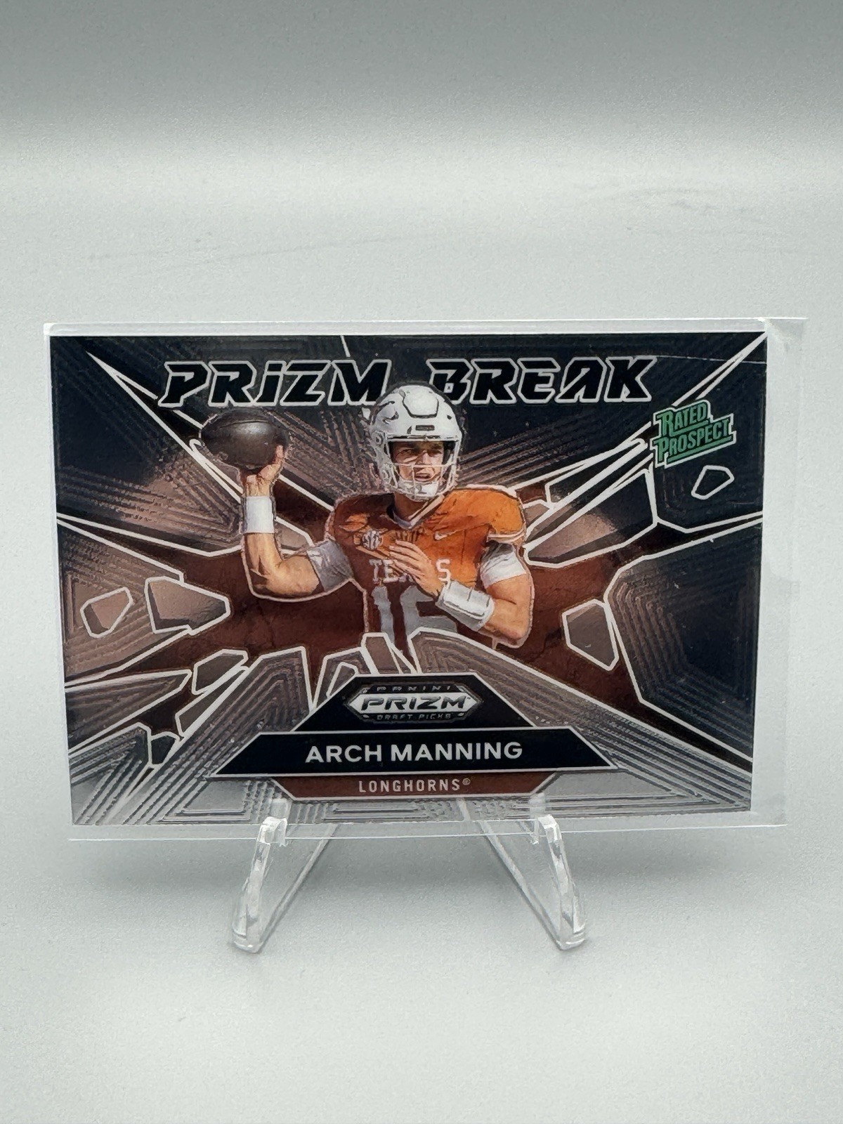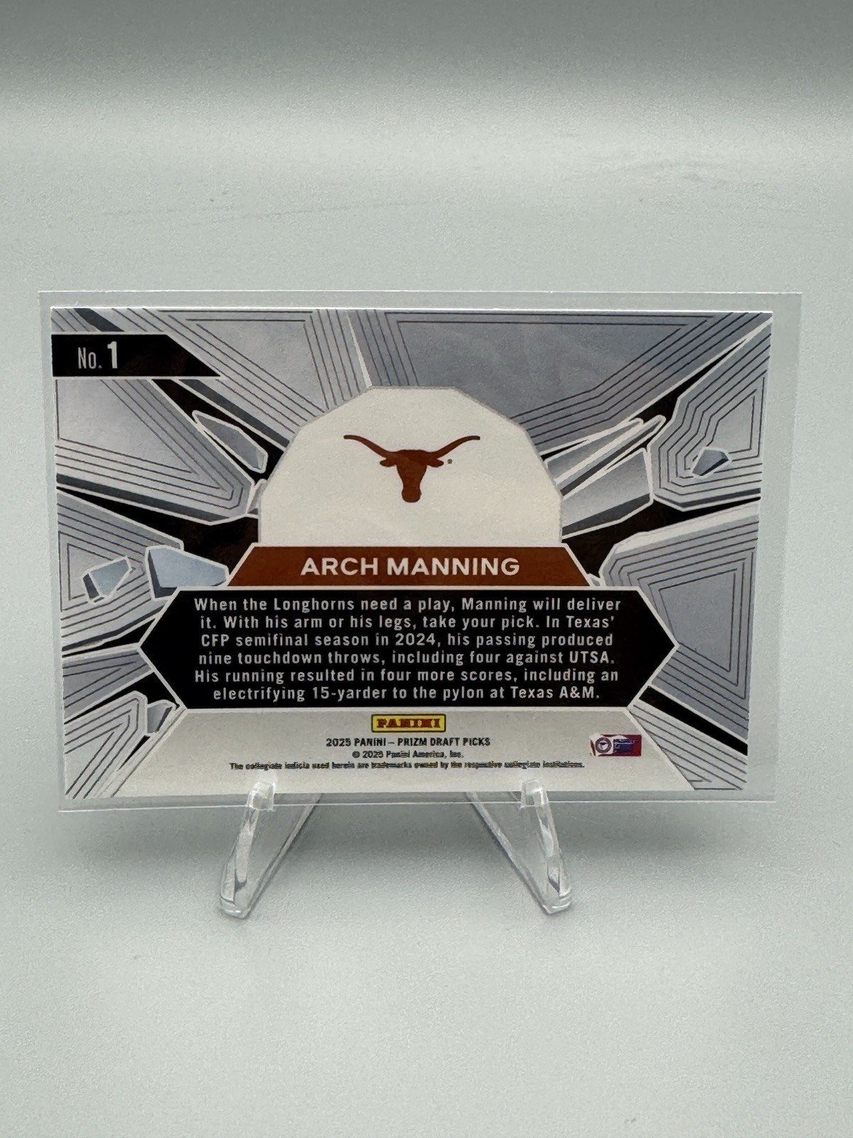 The 2025 Prizm Draft Picks Arch Manning Base Inserts are a set of 4 football trading cards featuring the player Arch Manning from the Texas Longhorns. These standard-sized cards are made of card stock and are original licensed prints by Panini. The cards do not come autographed, but they do include a label or sticker autograph format for authenticity. With a focus on rookie players, these cards are a great addition for fans looking to collect and hype up their favorite athletes.