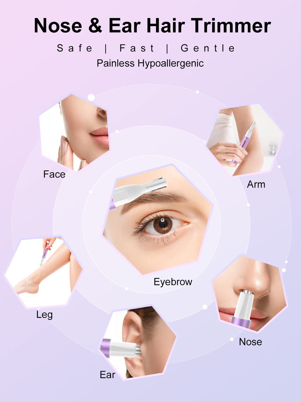 【Multifunctional Nose Hair Trimmer】: This 5 in 1 face trimmer including eyebrow trimmer,nose hair trimmer,ear hair trimmer and bikini razor,easy to replace,no noise, comfortable and quiet,meet your needs at different. 【Powerful & Painless】Sensitive skin stays smooth, soft, and free from irritation with skin-protecting foil. Trimmer for women features a 360° upgraded rotary cutting system and high-quality powerful motor that cuts hairs inside the ears and nose as well as sideburns evenly and cleanly in a pain-free manner. Ensure you bloom with confidence all day. 【USB Rechargeable】Nose hair trimmer say goodbye to the hassle of replacing batteries,this rechargeable electric razor for women has a super power storage capacity.Without buying more batteries.(Please charge for 2-3 hours before use) 【Water-Resistant & Easy To Clean】:Ear and nose trimmer for women has a washable head to ensure your pen trimmer is clean after each use.Plus,comes with a cleaning brush and a dust-proof cap to make maintaining and cleaning a breeze. 【Compact & Portable】Eyebrow trimmer for women has a stylish profile pocket size design, space-saving and lightweight.Flawless facial hair remover compact design means you can take this tool anywhere with you for on-the-go grooming. 【Worry-Free Refund Guarantee】:This facial hair remover for women provides a 30-day return policy and a 1-year warranty. Intimate customer support 7 days a week. If you have any questions, please feel free to email us and we will solve it for you within 24 hours.