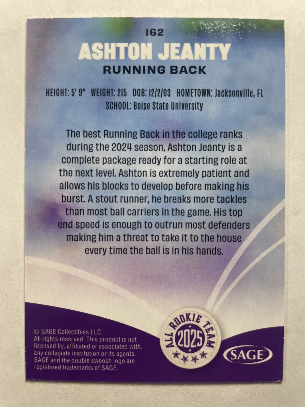 The product is a 2025 Sage High Series Ashton Jeanty rookie trading card from the All Rookie Team Purple parallel. This card features the player from Boise State Broncos and is numbered 162 in the set. It is a valuable collectible for football fans and collectors, showcasing a promising rookie player in the National Collegiate Athletic Association (NCAA) league. The card is from the manufacturer SAGE and is a sought-after item due to its rarity as a black parallel variety. It would make a great addition to any sports trading card collection.