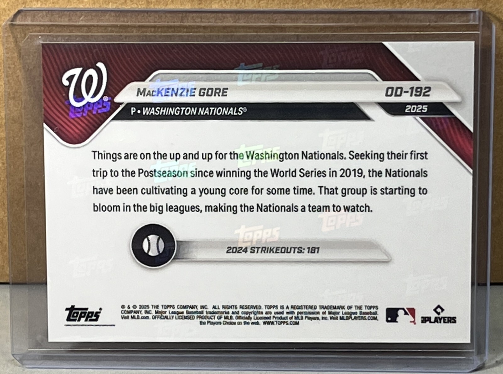 2025 TOPPS NOW ROAD TO OPENING DAY #OD-192 MACKENZIE GORE WASHINGTON NATIONALS. Green Foil Parallel serial #'d 59/99. Worldwide shipping available. U.S. - Winning bidder to add $3.99 for careful USPS first class shipping with delivery confirmation. Add .50 for each additional item. All other countries - ship costs are calculated by eBay through international shipping program. Please message if interested in multiple items. Bid with confidence, 49000+ feedback. Thanks and check out my auctions ending every Sunday. Please note that combined ship rates are for items paid for on one invoice, thanks!