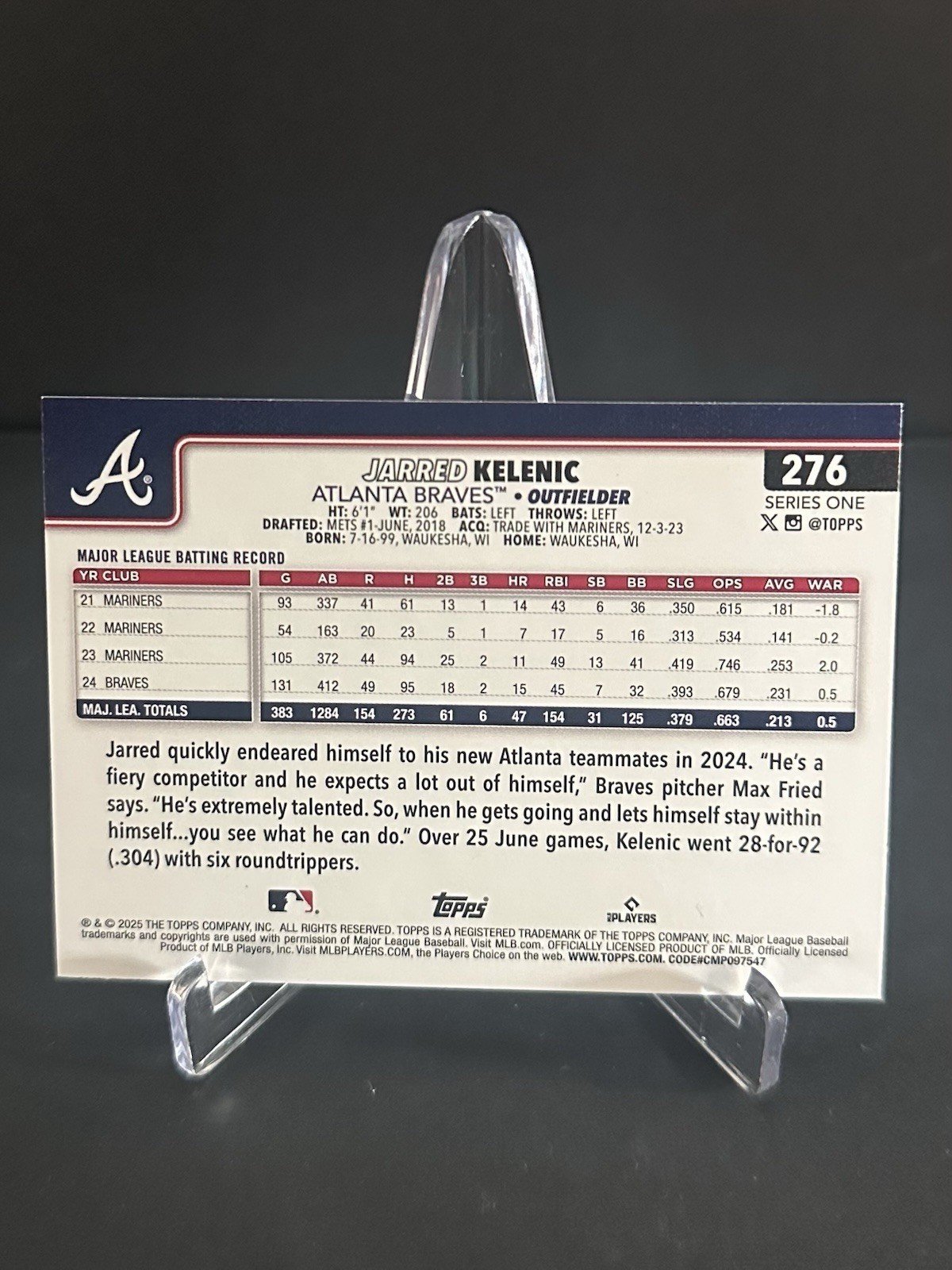 The 2025 Topps Baseball Series One Jarred Kelenic card featuring a Silver Prizm parallel design is a highly sought-after sports trading card for Major League Baseball fans. Manufactured by Topps, this original card showcases the talented player from the Atlanta Braves in the MLB World Series event. Made of sturdy card stock with a thickness of 20 Pt., this standard-sized card is a must-have for collectors looking to add a rare and valuable piece to their collection.