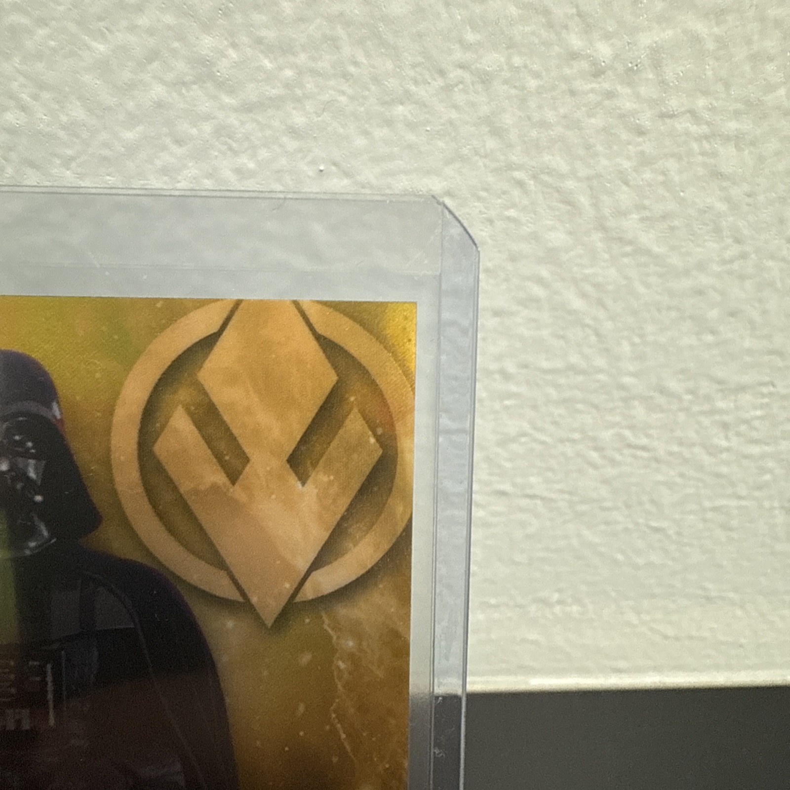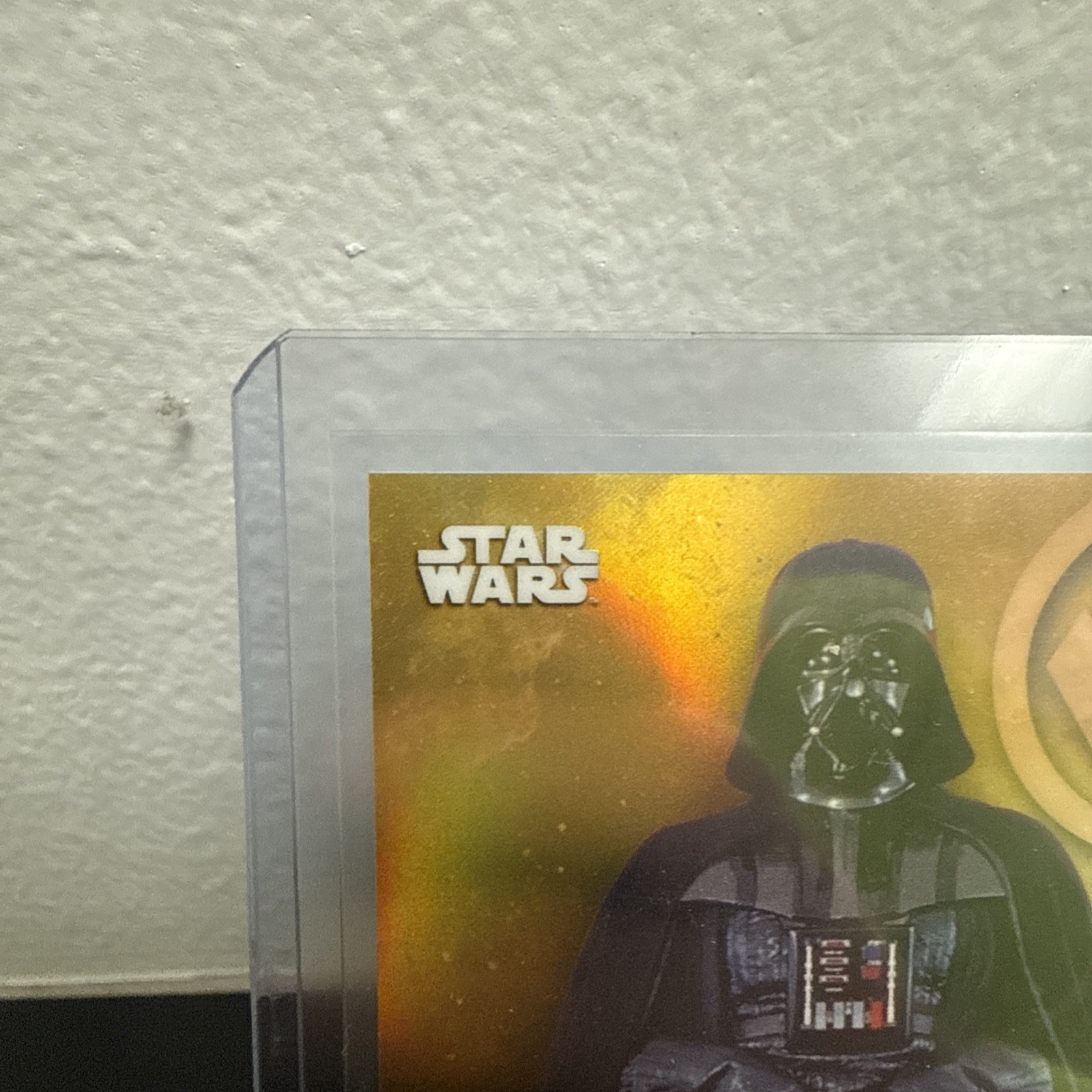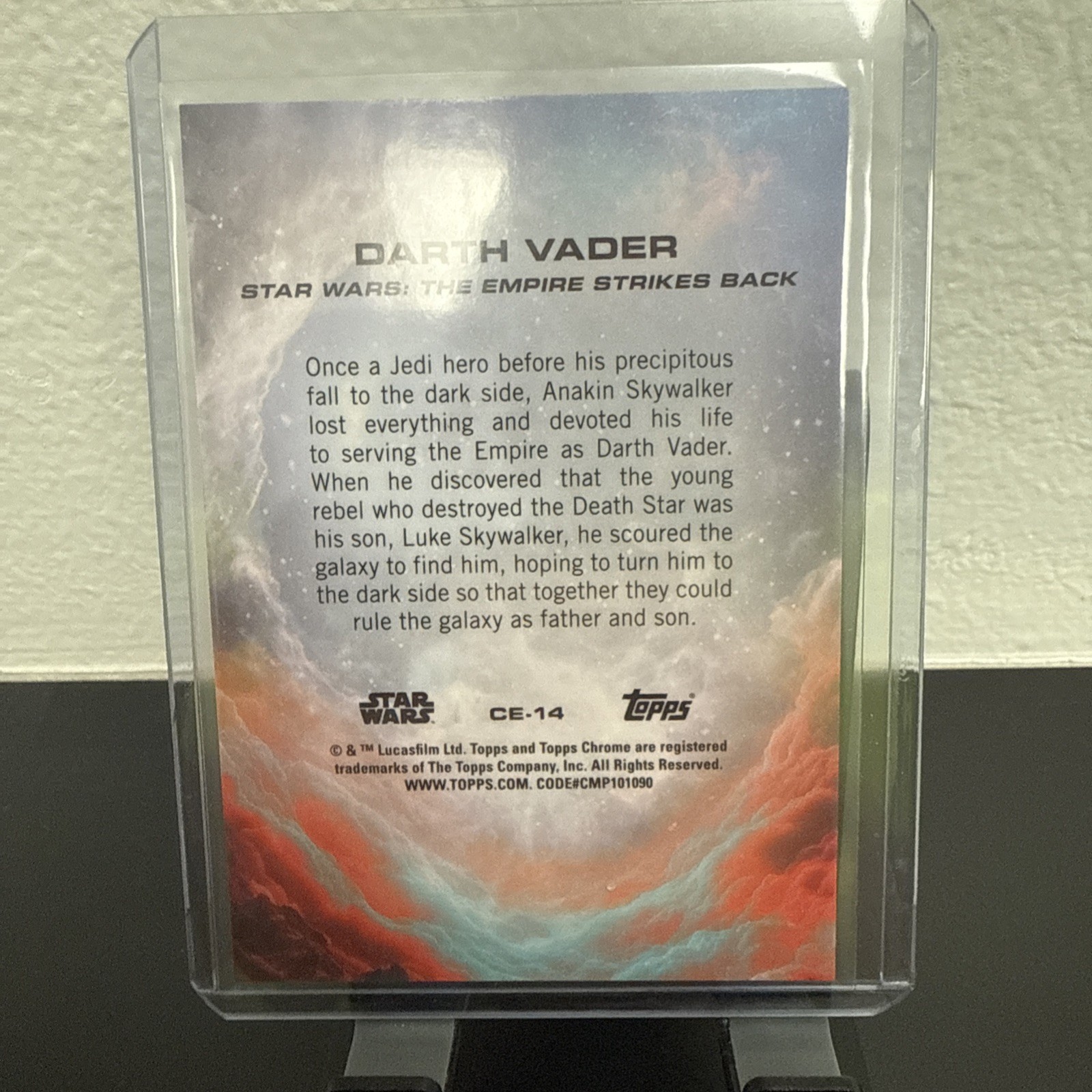 The product is a highly sought-after 2025 Topps Chrome Star Wars #CE-14 Darth Vader Gold Refractor trading card, limited to a print run of only 50 copies. This collectible card features the iconic character Darth Vader from the Star Wars franchise, specifically from Star Wars: Episode III – Revenge of the Sith and Star Wars: Rebels. Manufactured by Topps, the card is made of high-quality card stock with a thickness of 35 Pt., and includes features such as being serial numbered 41/50 a short print, and an insert in the set. This rare and valuable card is a must-have for any Star Wars fan or trading card collector.
