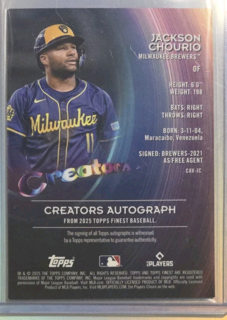 The product is a 2025 Topps Finest Jackson Chourio Creators On Card Auto trading card, autographed by the player Jackson Chourio himself. This card is a rare find, as it has a limited print run of only 50 copies, making it a valuable addition to any baseball card collection. The card is made of high-quality card stock and features a refractor parallel variety, adding to its aesthetic appeal. Additionally, it is part of the Topps Finest set for the 2025 MLB season, showcasing the promising talent of Jackson Chourio from the Milwaukee Brewers.