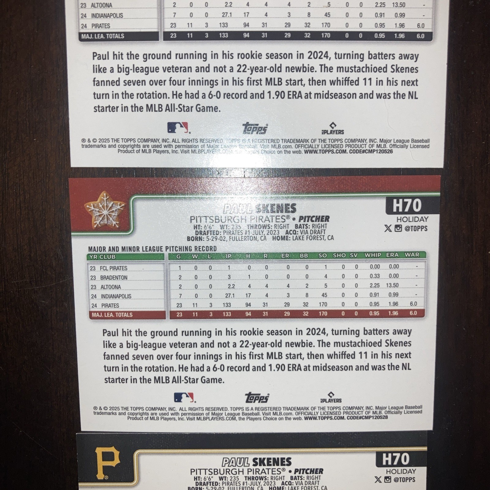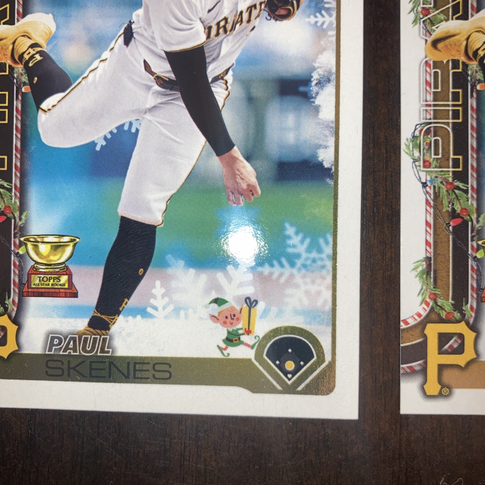 The 2025 Topps Holiday baseball trading card featuring Paul Skenes of the Pittsburgh Pirates is a special edition Hidden Elf Red Back Christmas Cookie SP card. This limited edition collectors' item is part of the exclusive 2025 Topps Holiday set, making it a highly sought-after addition to any sports trading card collection. With its unique design and special features, this card is sure to stand out as a rare find for fans and collectors alike. 3 cards total. Hidden Elf SP. Red Back Christmas Cookie SP. Base