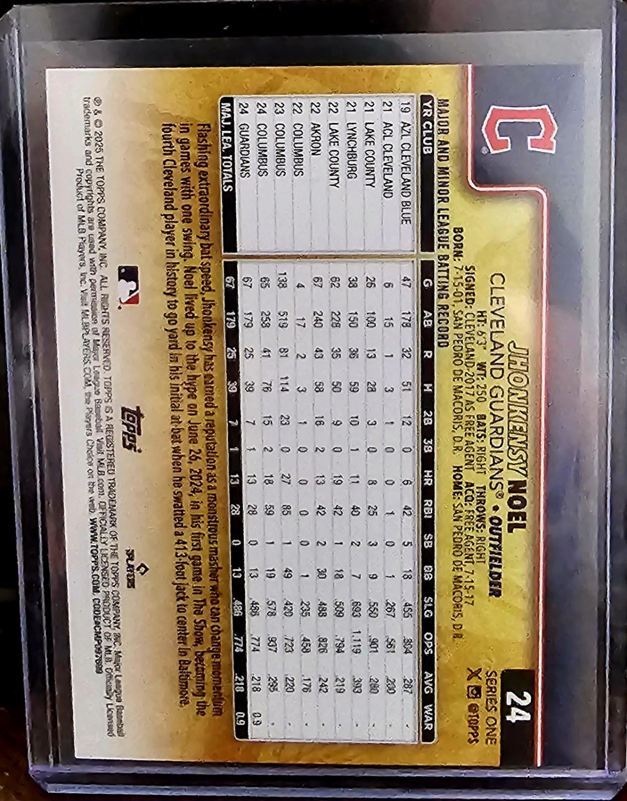 The product is a 2025 Topps trading card featuring Jhonkensy Noel of the Cleveland Guardians. This particular card is a Golden Mirror Image Variation SSP (Super Short Print) card, making it a rare and sought-after collectible for baseball fans and card enthusiasts. The card is from the Major League (MLB) and is part of the 2025 Topps set. It is a valuable addition to any sports trading card collection, especially for fans of the Cleveland Guardians or collectors of unique parallel varieties.