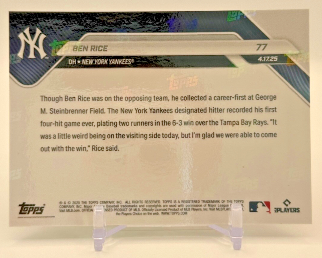 Capture a piece of baseball history with the 2025 Topps NOW Card #77 featuring Ben Rice of the New York Yankees. This card commemorates Ben Rice's rookie season and his impressive 4-hit game, marking it as a must-have for collectors and fans alike. The card is part of the renowned Topps NOW series, which captures the essence of the modern MLB experience. This officially licensed product is produced with quality card stock and features the standard card size, perfect for displaying or safekeeping. As an original release from the 2025 manufacturing year, it is a contemporary collectible that reflects the player's early career promise. Whether you're a Yankees supporter or a connoisseur of rookie cards, this piece is a valuable addition to any collection.