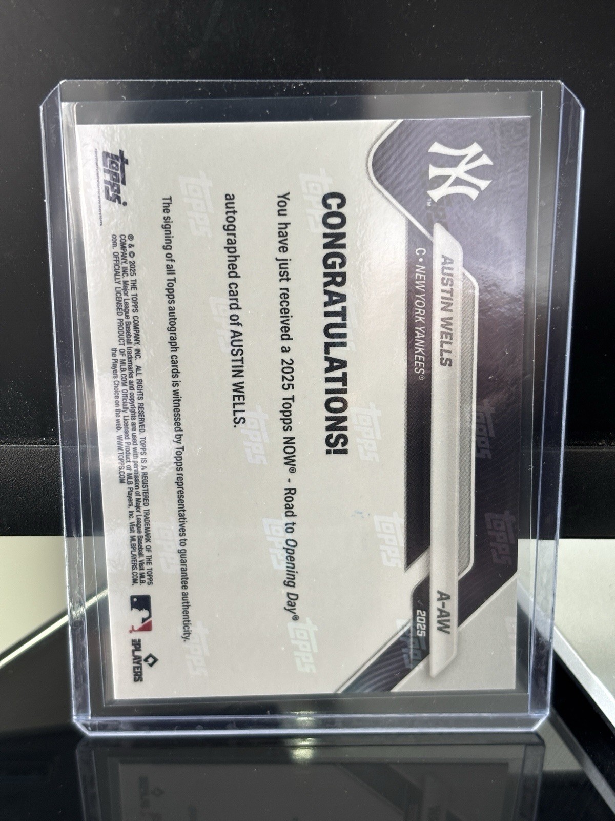 Capture a piece of baseball history with the 2025 Topps Now Road to Opening Day card featuring rising star Austin Wells of the New York Yankees. This limited edition collectible, numbered 96 out of 99, showcases Wells in action with an authentic autograph that's been certified by Topps. The distinctive green parallel variety adds an extra layer of rarity and visual appeal to this standout card. For fans of the Yankees or collectors seeking to secure a piece of the 2025 season, this card is a must-have. With its standard card size and 20 Pt. thickness, it's designed to fit seamlessly into any collection. The card's originality, coupled with the serial numbering and hard-signed autograph, ensures it's a valuable and treasured asset for years to come.