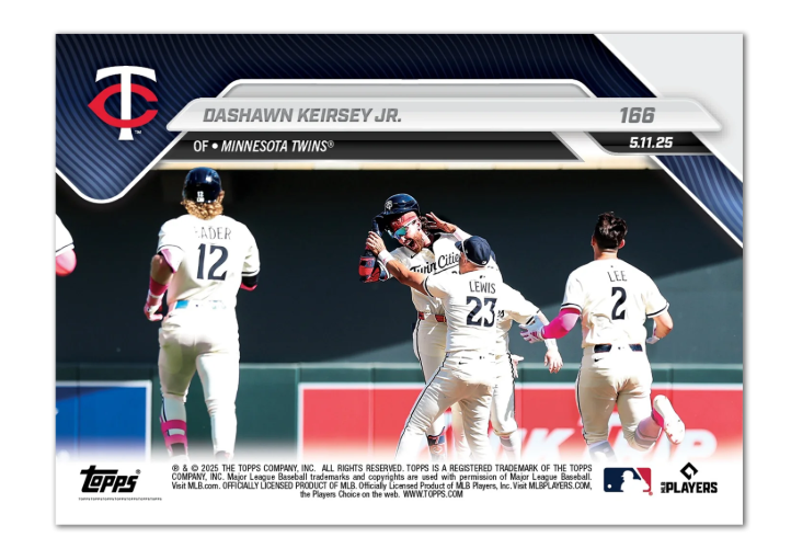 You are bidding on the item listed in the title: 2025 Topps Now Dashawn Keirsey Jr. #166 Rookie Walk-Off Hit Twins IN HAND! Please Note –This is IN HAND! I will have it shipped out in 1-3 Business days! 1 day will be the overwhelmingly majority of orders but occasionally I may be gone for an extra day! Please Note – I will be buying most Topps Now products in 2025 and will be listing the cards daily. Make sure you follow along to miss any new drops! Shipping on items that sell for under $10 – will be via eBay Standard Envelope. Card placed in a penny sleeve, then placed inside of a Card Saver. Card saver will be taped shut with a small piece of painter’s tape – the item will then be tucked inside of a folded piece of paper and placed into a plain white envelope – if this is not your preferred method, please consider buying from someone else. Shipping on items that sell for $10 to $20 will be via eBay Standard Envelope. Card placed into penny sleeve, into a top loader, sealed shut with a team bag. Card then placed inside of 6x4 cardboard thank you card and properly sized envelope to ship. If this is not your preferred method, please consider buying from someone else. Cards that sell for over $20 will be shipped via double bubble mailer! Any additional questions please message me! Please don't let my low feedback sway you from purchasing from me! I have another account with over 20,000 feedback - I'm starting this account strategically for presale items only!