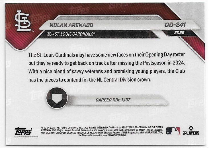 You are bidding on the item listed in the title: 2025 Topps Now Nolan Arenado #OD-241 Road to Opening Day Green #'d /99 Cardinals Please Note - This item is IN HAND. If purchased separately it will be shipped within 1 business day but if you purchase this item with a presale item, the entire order will ship together. Most products are in hand within 2-4 weeks. Please Note – I will be buying most Topps Now products in 2025 and will be listing the cards daily. Make sure you follow along to miss any new drops! Shipping on items that sell for under $10 – will be via eBay Standard Envelope. Card placed in a penny sleeve, then placed inside of a Card Saver. Card saver will be taped shut with a small piece of painter’s tape – the item will then be tucked inside of a folded piece of paper and placed into a plain white envelope – if this is not your preferred method, please consider buying from someone else. Shipping on items that sell for $10 to $20 will be via eBay Standard Envelope. Card placed into penny sleeve, into a top loader, sealed shut with a team bag. Card then placed inside of 6x4 cardboard thank you card and properly sized envelope to ship. If this is not your preferred method, please consider buying from someone else. Cards that sell for over $20 will be shipped via double bubble mailer! Any additional questions please message me! Please don't let my low feedback sway you from purchasing from me! I have another account with over 20,000 feedback - I'm starting this account strategically for presale items only!