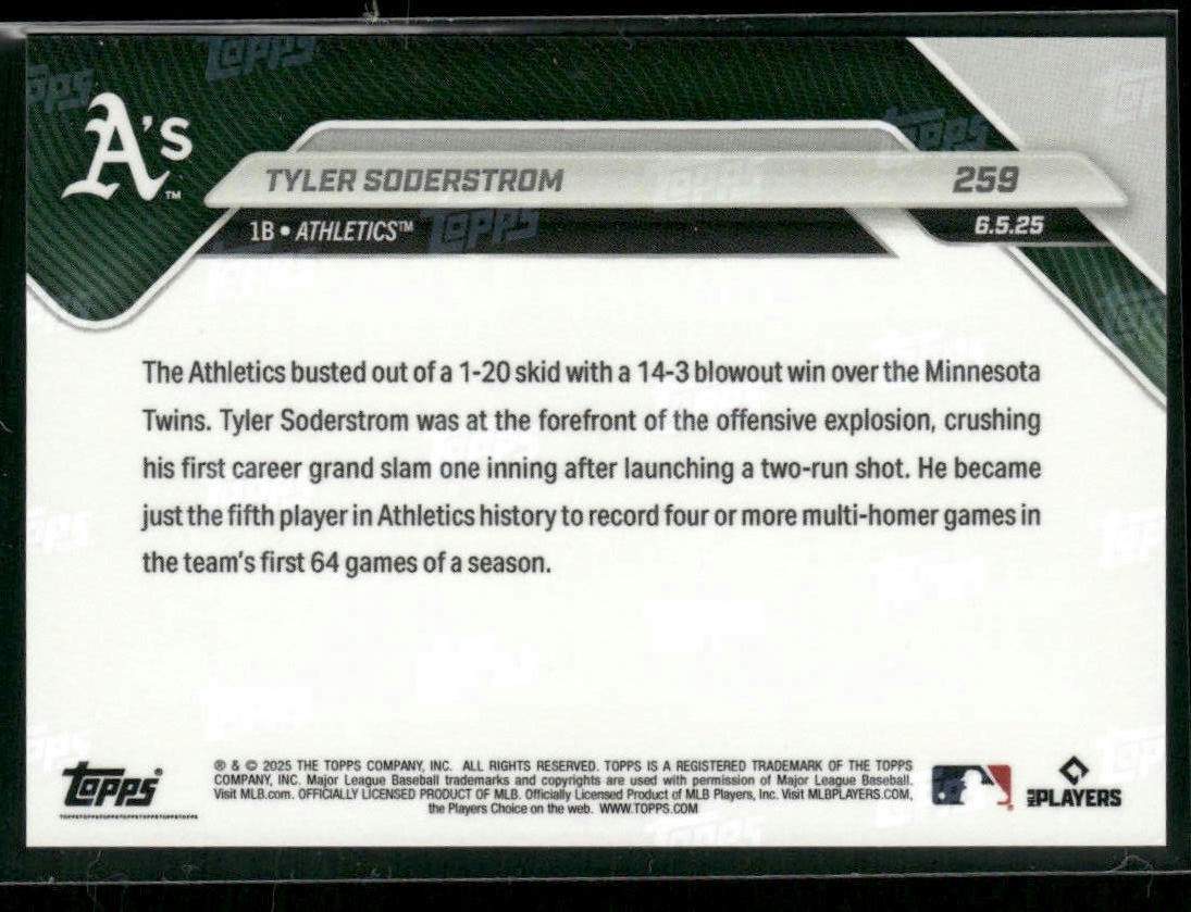 Up for sale is a 2025 Topps Now #259 Tyler Soderstrom card, celebrating his 1st career grand slam that powered a monster 6-RBI afternoon for the Oakland Athletics. This moment of breakout power is highlighted on the front, declaring: “1st Career Grand Slam Powers 6‑RBI Afternoon” , with a limited print run of 567 . Card Details: Player: Tyler Soderstrom Team: Oakland Athletics Set: 2025 Topps Now Card Number: #259 Moment: 1st Career Grand Slam Powers 6‑RBI Afternoon Print Run: 567 About the Moment: Tyler Soderstrom etched his name into A’s lore by hitting his first career grand slam, driving in six runs and turning in a historic offensive performance. The card immediately commemorates this electrifying display of power and clutch hitting. About the Player: Tyler Soderstrom , one of the most exciting young talents in the Oakland organization, is quickly making waves with his bat and power potential. This breakout performance underlines why fans and collectors are so excited about his future in the big leagues. Why This Card? ✅ Celebrates a historic grand slam and 6-RBI performance ✅ Features a rising Athletics talent ✅ Limited-print run of 567 ✅ Part of the coveted 2025 Topps Now moment-driven series Add this powerful Tyler Soderstrom moment to your collection today—thanks for checking it out, and happy collecting! ⚾💥📈