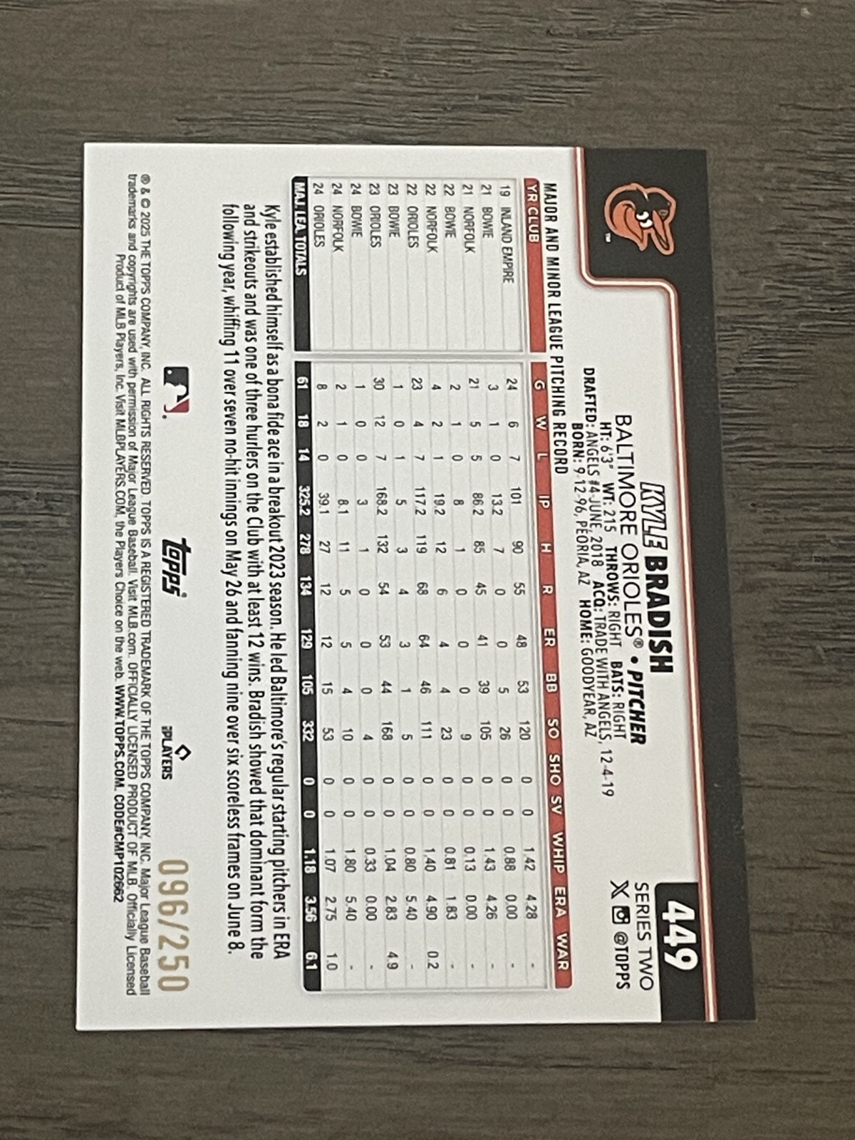 2025 Topps Purple Rainbow Foil Kyle Bradish #449 Baltimore Orioles /250 You are bidding on the exact Cards in the photos. Please take a close look at the photos to determine the exact condition of the Cards for yourself. Near Mint Please check out my eBay store for more items. Free Shipping is sent via eBay Standard Envelope (Non Padded Envelope w/ eBay Tracking) Thanks for looking!!!