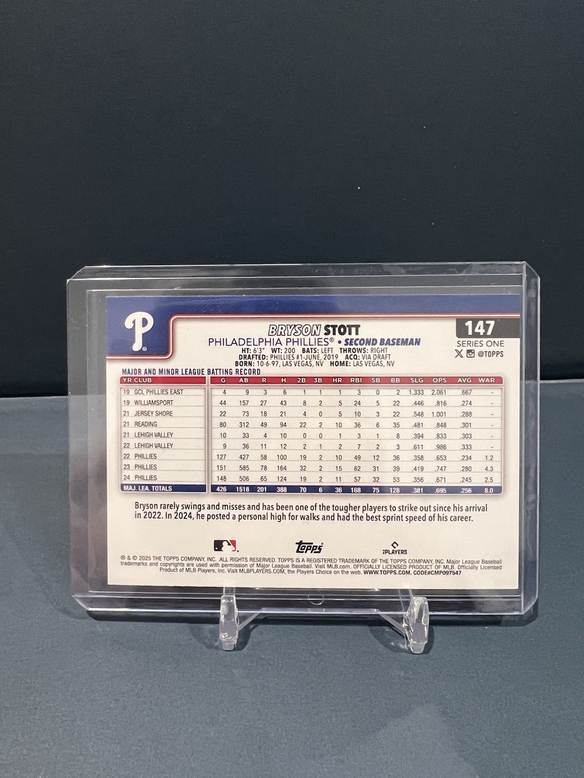 Capture the excitement of the diamond with the 2025 Topps Series 1 Baseball card featuring Bryson Stott of the Philadelphia Phillies. This Rainbow Foil parallel card, number 147, showcases the promising talent of Stott, making it a standout addition to any baseball card collection. Expertly manufactured by Topps, this card is part of the renowned 2025 series and is a must-have for fans and collectors alike. It highlights Stott's athlete prowess and is a vibrant tribute to the sport of baseball, celebrating the Philadelphia Phillies with flair.