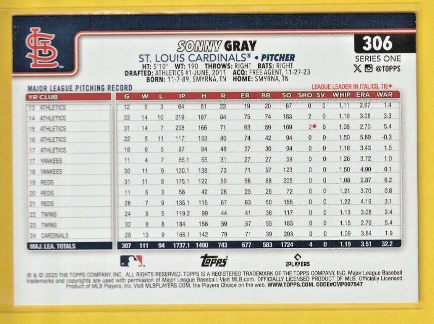 2025 Topps Series 1 Baseball SONNY GRAY Pink Diamante Parallel #306 Card has been sleeved and will be inserted into a toploader for mailing/shipping purposes. Ships by eBay Standard Envelope.