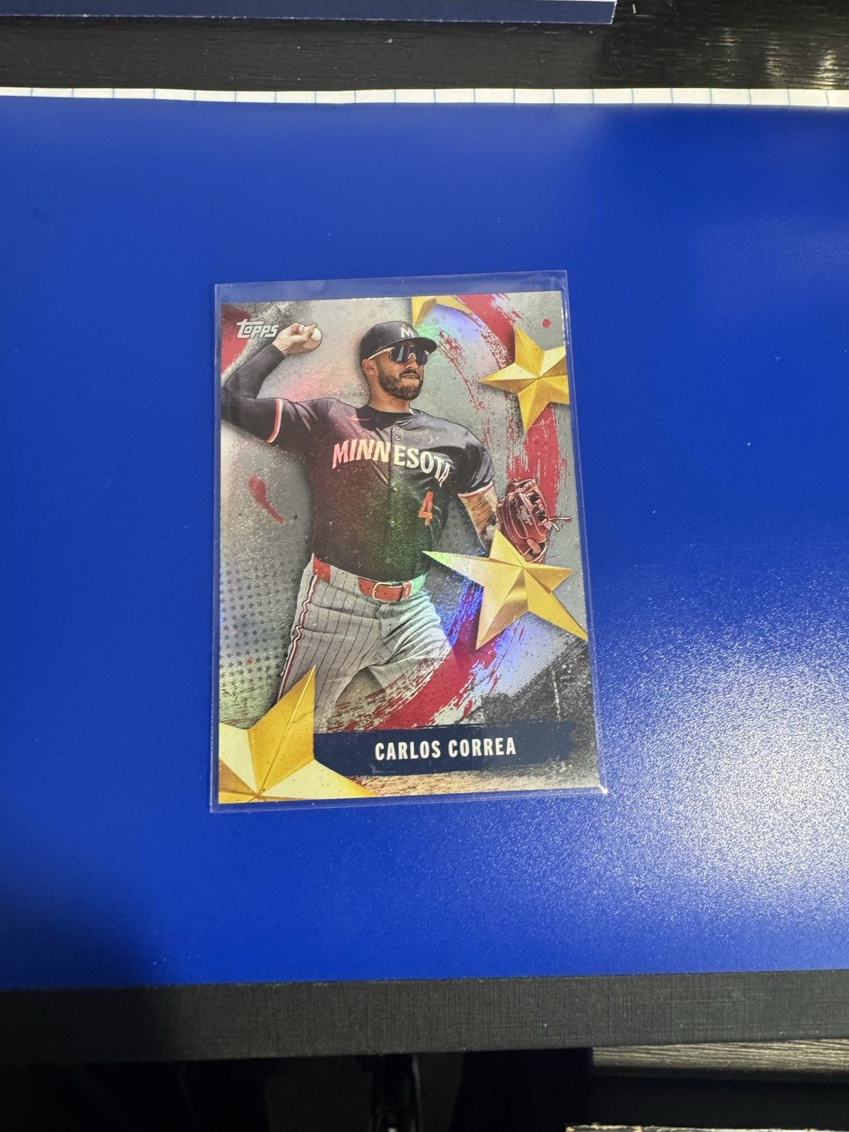 Elevate your collection with the 2025 Topps Series 1 Stars of MLB card featuring Carlos Correa of the Minnesota Twins. This card, numbered SMLB-28, captures the essence of the shortstop's prowess on the field and is a must-have for baseball enthusiasts and collectors alike. The Stars of MLB insert set is renowned for showcasing the game's most talented players, and this card is a prime example, highlighting the excellence of Correa's contribution to the sport. The card boasts an array of features that make it a valuable find, including its place in the base set of the 2025 Topps Series, the hologram that adds a three-dimensional effect, and the framed version that exudes a sense of sophistication. It's a collector's edition that is both exclusive and a testament to the player's rookie season. Whether you're a fan of the Twins, a follower of Correa's career, or a connoisseur of MLB memorabilia, this card is a notable acquisition for any collection.