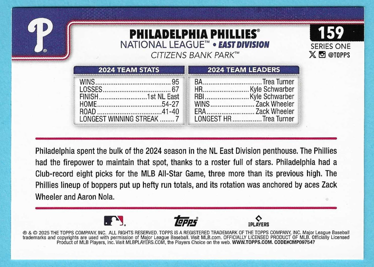 Capture the excitement of the diamond with the Philadelphia Phillies Rainbow Foil 2025 Topps Series 1 Baseball Team Card #159. This stunning card celebrates the spirit of America's favorite pastime and is a must-have for fans and collectors alike. Showcasing the Philadelphia Phillies, this card is part of the highly sought-after 2025 Topps set, renowned for its quality and collectibility. Crafted with a captivating rainbow foil design, this card not only features the Philadelphia Phillies but also boasts a range of exclusive elements such as the Checklist, Promo, and Limited Edition status, making it a standout piece. As an original English-language issue from the United States, it's a testament to the rich history of Major League Baseball and a fine addition to any collection.