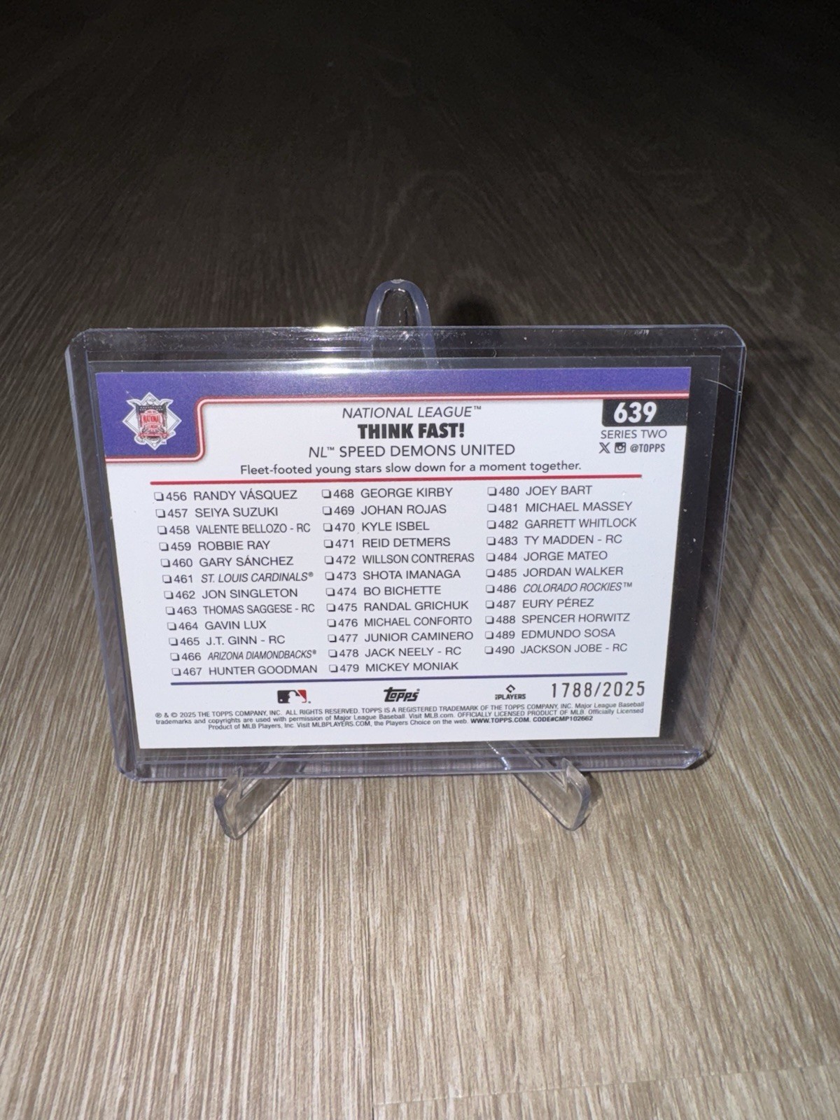 The 2025 Topps Series 2 #639 NL Think Fast Gold Card is a limited edition sports trading card featuring Major League Baseball players C.J. Abrams and Elly De La Cruz from the Washington Nationals and Cincinnati Reds respectively. This rare card, with a print run of 1788 out of 2025, is part of the Topps set for the 2025 baseball season. A valuable collector's item for fans of baseball memorabilia, this gold parallel variety card is in near mint or better condition, making it a sought-after piece for enthusiasts and collectors alike.