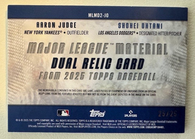 Player/Athlete:Aaron Judge, Shohei OhtaniLeague:Major League (MLB)Features:Insert, Memorabilia, Parallel/Variety, Serial NumberedPrint Run:25Vintage:NoCard Number:MLMD2-10Autographed:NoInsert Set:Major League Material Dual RelicsType:Sports Trading CardManufacturer:ToppsSport:BaseballYear Manufactured:2025Team:Los Angeles Dodgers, New York YankeesParallel/Variety:RelicSet:2025 Topps Series 2