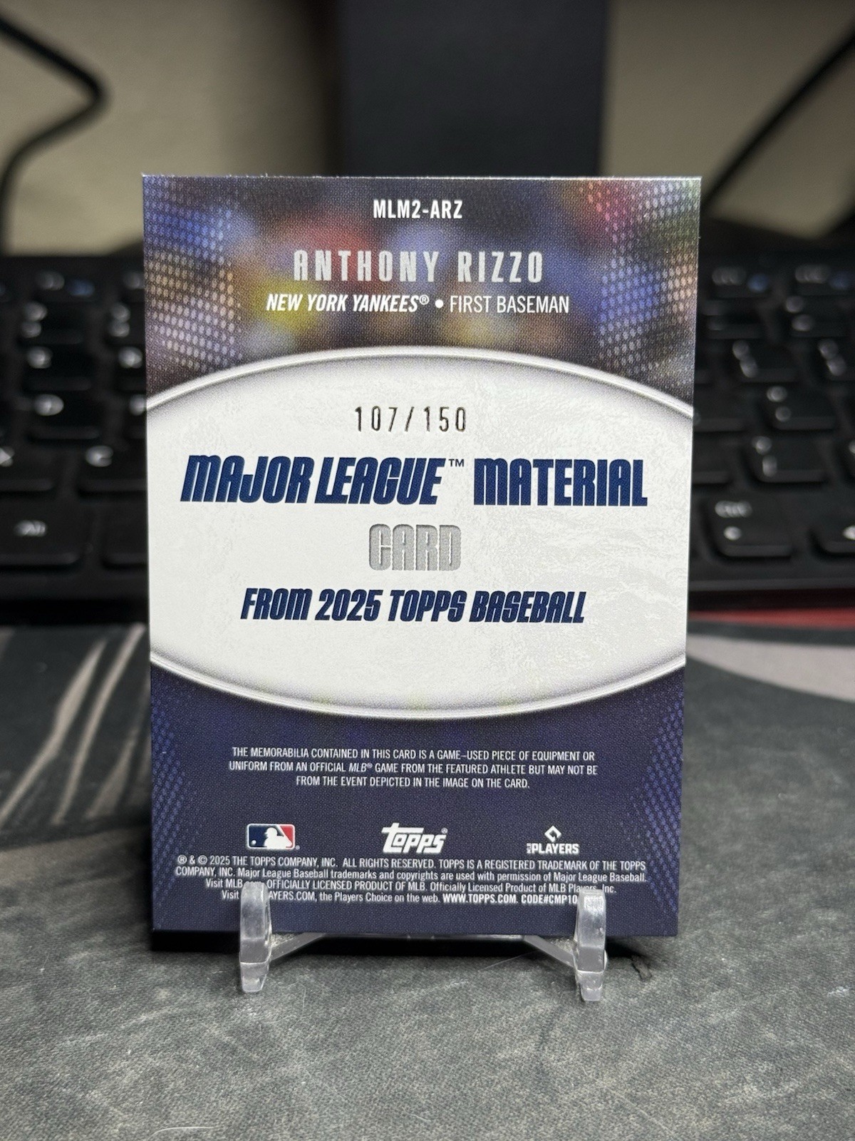 The 2025 Topps Series 2 Anthony Rizzo /150 Major League Material Patch #MLM2-ARZ is a highly collectible sports trading card featuring an oversized patch of memorabilia from Anthony Rizzo of the New York Yankees. This limited edition card is part of the 2025 Topps set, with only 150 copies in existence. It is a great addition for baseball fans and collectors looking to own a piece of Major League history.