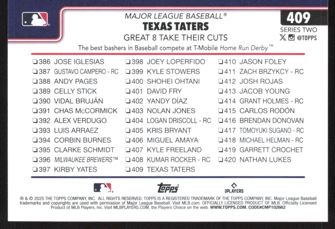 About Me Other Listings Feedback Add to Favorites Contact Me eBay Store DJ Chino Sports 2025 Topps Series 2 Base Great 8 Take Their Cuts Texas Taters #409 No stock photo / These are real scans or pictures Details Description: Great 8 Take Their Cuts Category: Baseball Year: 2025 Product: Topps Series 2 Set: Base Team: Texas Taters Card Number: 409 Dimensions: 3½" x 2½" SKU: BL A0000 R01 R (274) Payment Payment due upon purchase. Shipping Shipping - Please see shipping for pricing and details. - Every card (excluding graded cards) will be shipped in a penny sleeve and Card Saver. Some cases in a top loader. - Any damage to your card during shipping, or not received. I will contact eBay to issue a refund. - I honor combined shipping and discounted shipping for additional items. For standard cards, $.10 each for additional cards. For more information, please check shipping details. - For Graded Cards, I will be shipping in a standard box and well protected. Rookie Free returns within 30 days of purchase. About Us Welcome to my store. I have been collecting cards for 30+ years and enjoy collecting. I am starting my store so that I can share my collection to the world. Please check out my other listings and feel free to reach out to me with any questions. Thank you. Cards Information - Cards are scanned and immediately after break. - Please refer to photos for additional details. - Cards are in NMINT or better shape may have lines, smudges, different color, or dust due to the scanner. If you would like more details on this card. Please message me and will be happy to send other photos. - Cards may have minor flaws such as slight corner/edge dings, production printing, surface dimples, ect. Please message me if you have questions. - All my cards are stored in a cool environment and in card boxes. - With listings that have multiple quantities. I do label condition, and may not be the card you you see in the picture. If you would like additional photos, please let me know and will eBay message you photos. Listing By Kronocard trading cards software v2.8.4.8
