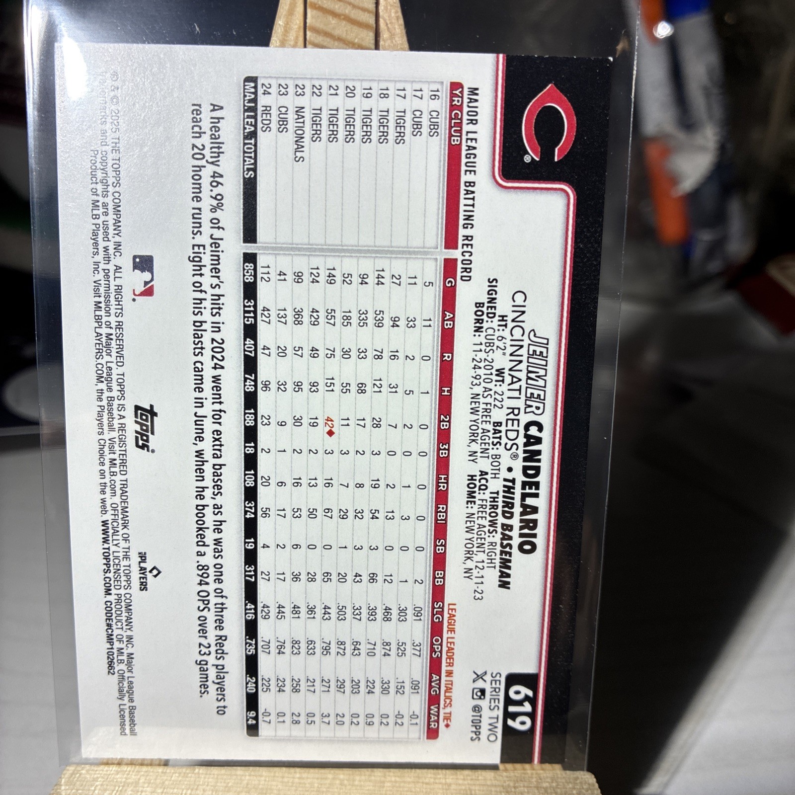 The product is a 2025 Topps Series 2 Diamante Foil trading card featuring Jeimer Candelario of the Cincinnati Reds. This card is part of the MLB World Series set and is manufactured by Topps. It is hard signed, 20 Pt. thick, and made of card stock in English. This original sports trading card is a parallel variety with the card number 619, making it a valuable addition to any baseball card collection.