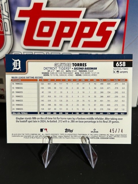 This listing includes a BLACK BORDER PARALLEL from the 2025 Topps Series 2 set featuring Tigers second baseman GLEYBER TORRES and is SERIAL NUMBERED 45 out of 74! **FREE SHIPPING** As always, your card will ship out fast and secure. Please message with any questions. THANK YOU!!
