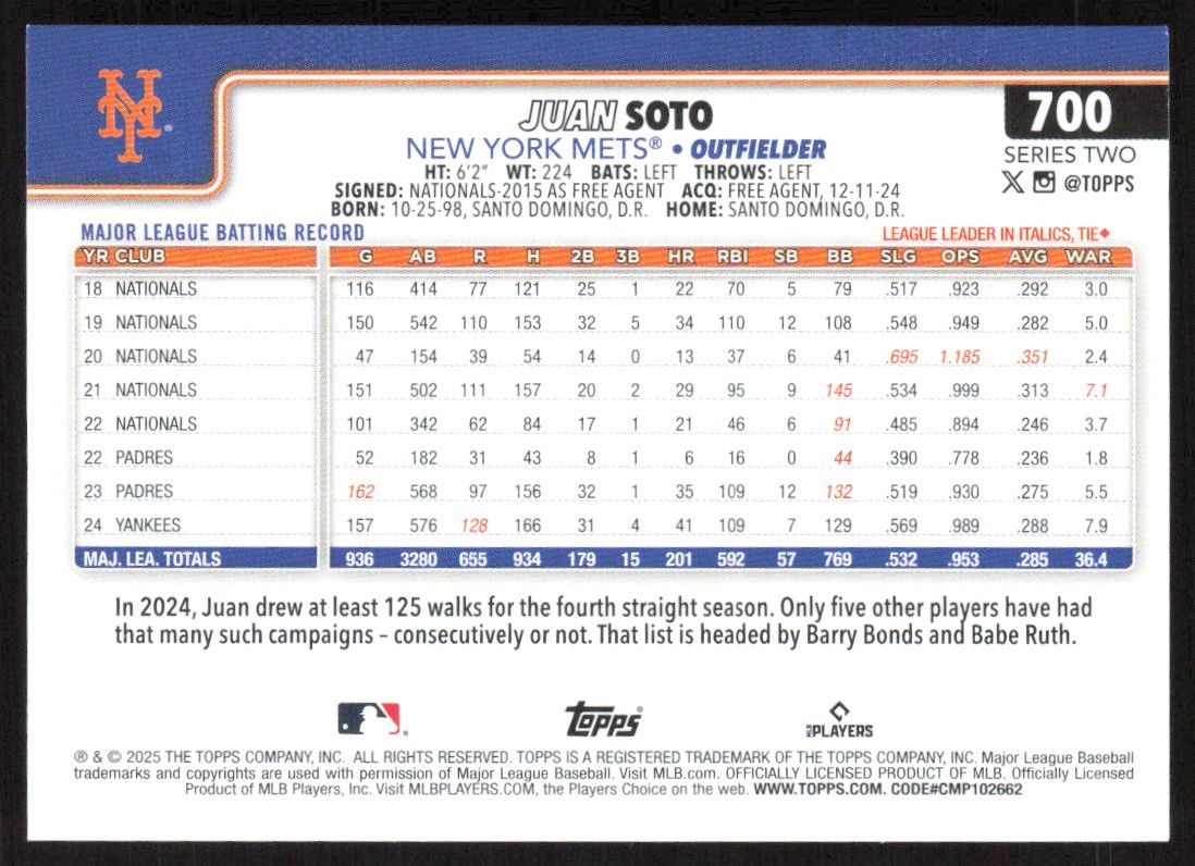 About Me Other Listings Feedback Add to Favorites Contact Me eBay Store DJ Chino Sports 2025 Topps Series 2 Base Juan Soto New York Mets #700 No stock photo / These are real scans or pictures Details Description: Juan Soto Category: Baseball Year: 2025 Product: Topps Series 2 Set: Base Team: New York Mets Card Number: 700 Dimensions: 3½" x 2½" SKU: BL A0000 R01 R (166) Payment Payment due upon purchase. Shipping Shipping - Please see shipping for pricing and details. - Every card (excluding graded cards) will be shipped in a penny sleeve and Card Saver. Some cases in a top loader. - Any damage to your card during shipping, or not received. I will contact eBay to issue a refund. - I honor combined shipping and discounted shipping for additional items. For standard cards, $.10 each for additional cards. For more information, please check shipping details. - For Graded Cards, I will be shipping in a standard box and well protected. Rookie Free returns within 30 days of purchase. About Us Welcome to my store. I have been collecting cards for 30+ years and enjoy collecting. I am starting my store so that I can share my collection to the world. Please check out my other listings and feel free to reach out to me with any questions. Thank you. Cards Information - Cards are scanned and immediately after break. - Please refer to photos for additional details. - Cards are in NMINT or better shape may have lines, smudges, different color, or dust due to the scanner. If you would like more details on this card. Please message me and will be happy to send other photos. - Cards may have minor flaws such as slight corner/edge dings, production printing, surface dimples, ect. Please message me if you have questions. - All my cards are stored in a cool environment and in card boxes. - With listings that have multiple quantities. I do label condition, and may not be the card you you see in the picture. If you would like additional photos, please let me know and will eBay message you photos. Listing By Kronocard trading cards software v2.8.4.8
