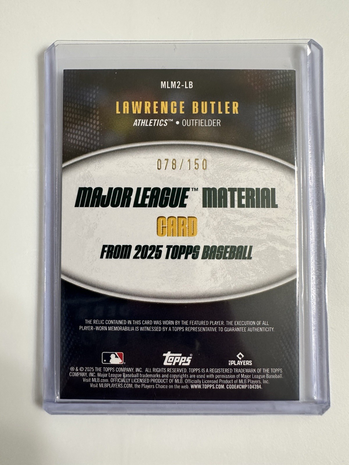 This card is a must-have for any serious collector! The Lawrence Butler relic is stunning in blue, limited to just 150, making it a rare gem. The quality is top-notch, and the design pops—perfect for adding value to your collection. Fast shipping and great communication from the seller. A true winner!