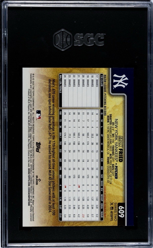 Player/Athlete:Max FriedParallel/Variety:Golden Mirror Image VariationCard Number:609Features:Parallel/Variety, Base SetManufacturer:ToppsTeam:New York YankeesSeries:Topps Series 2brand:ToppsSport:BaseballSet:2025 Topps Series 2League:Major League Baseball (MLB)Season:2025