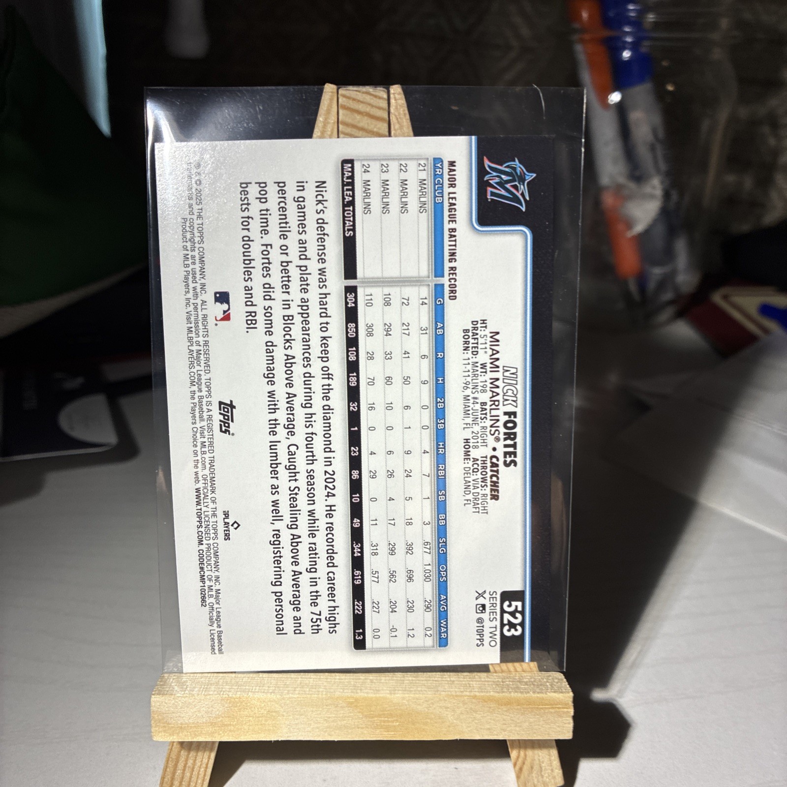 The 2025 Topps Series 2 Silver Rainbow Foil #523 Nick Fortes Miami Marlins trading card is a standard-sized sports collectible featuring the player Nick Fortes from the Miami Marlins. Part of the Major League Baseball league, this original single card from Topps is a part of the 2025 Series 2 set. The card is in near mint or better condition and includes a blue parallel variety, making it a unique and desirable addition to any baseball card collection.