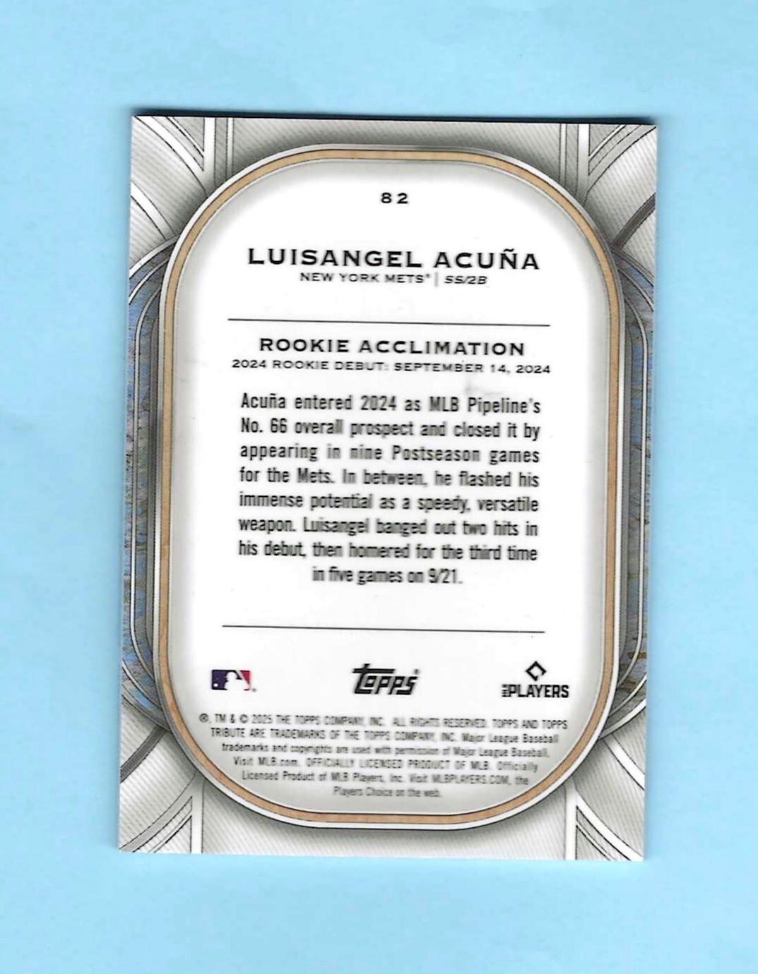 Features:Rookie, Serial Numbered, Base Set, Parallel/VarietySeason:2025Parallel/Variety:BlueAdditional Description:Luisangel AcuñaSeries:Topps TributeSport:BaseballCard Number:82brand:ToppsSet:2025 Topps TributePrint Run:150Manufacturer:ToppsTeam:New York MetsLeague:Major League Baseball (MLB)Player/Athlete:Luisangel Acuna