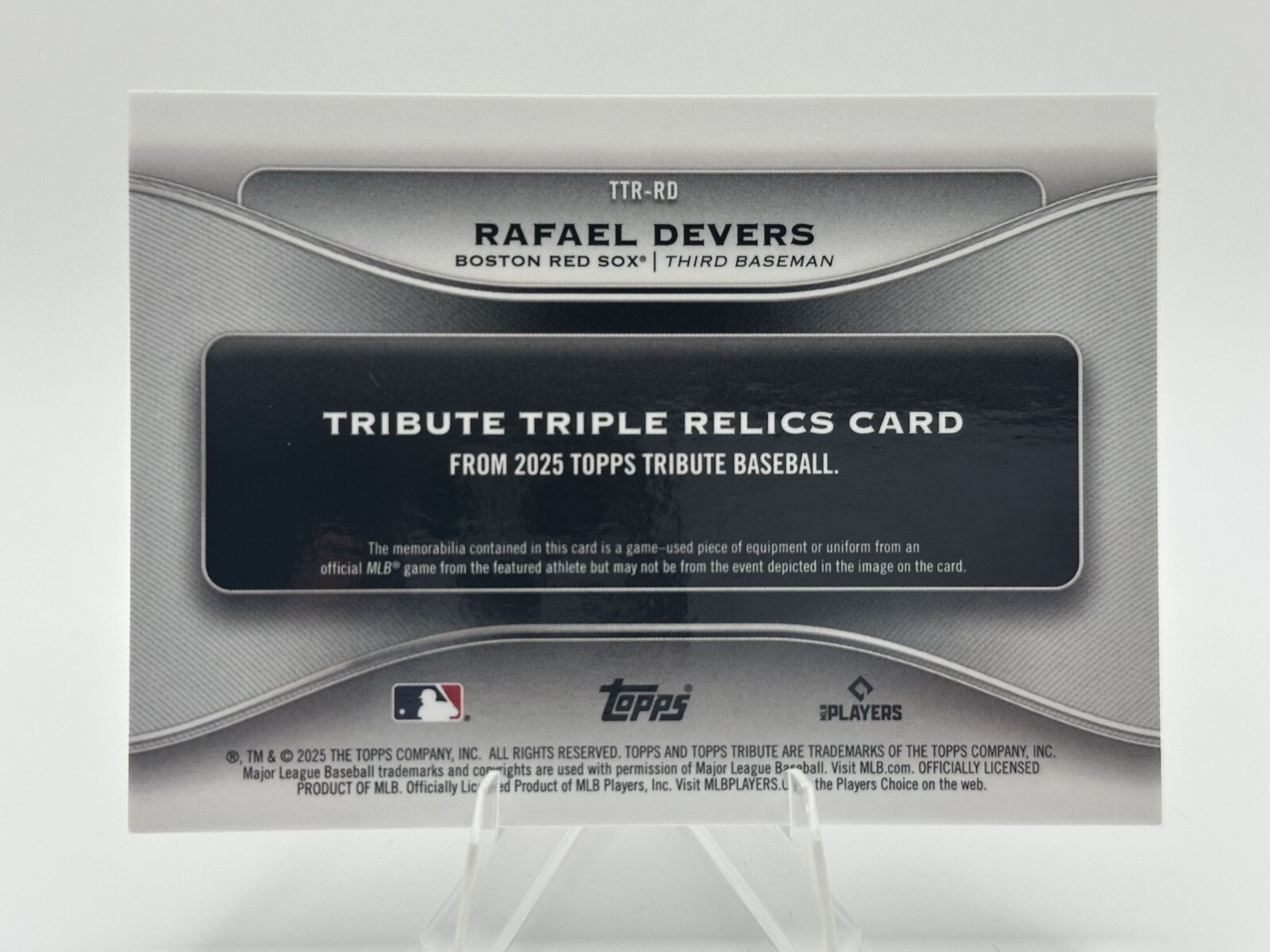 2025 Topps Tribute Rafael Devers Game Used Triple Relics Card /199 Print: 124/199 Cards can have any number of issues that do not detract from the overall look of the image on the card. These issues can include scratches/surface wear, and flaws on edges and corners. See photos provided for centering condition as well as to make your own assessment of card condition. All Sales are FINAL.