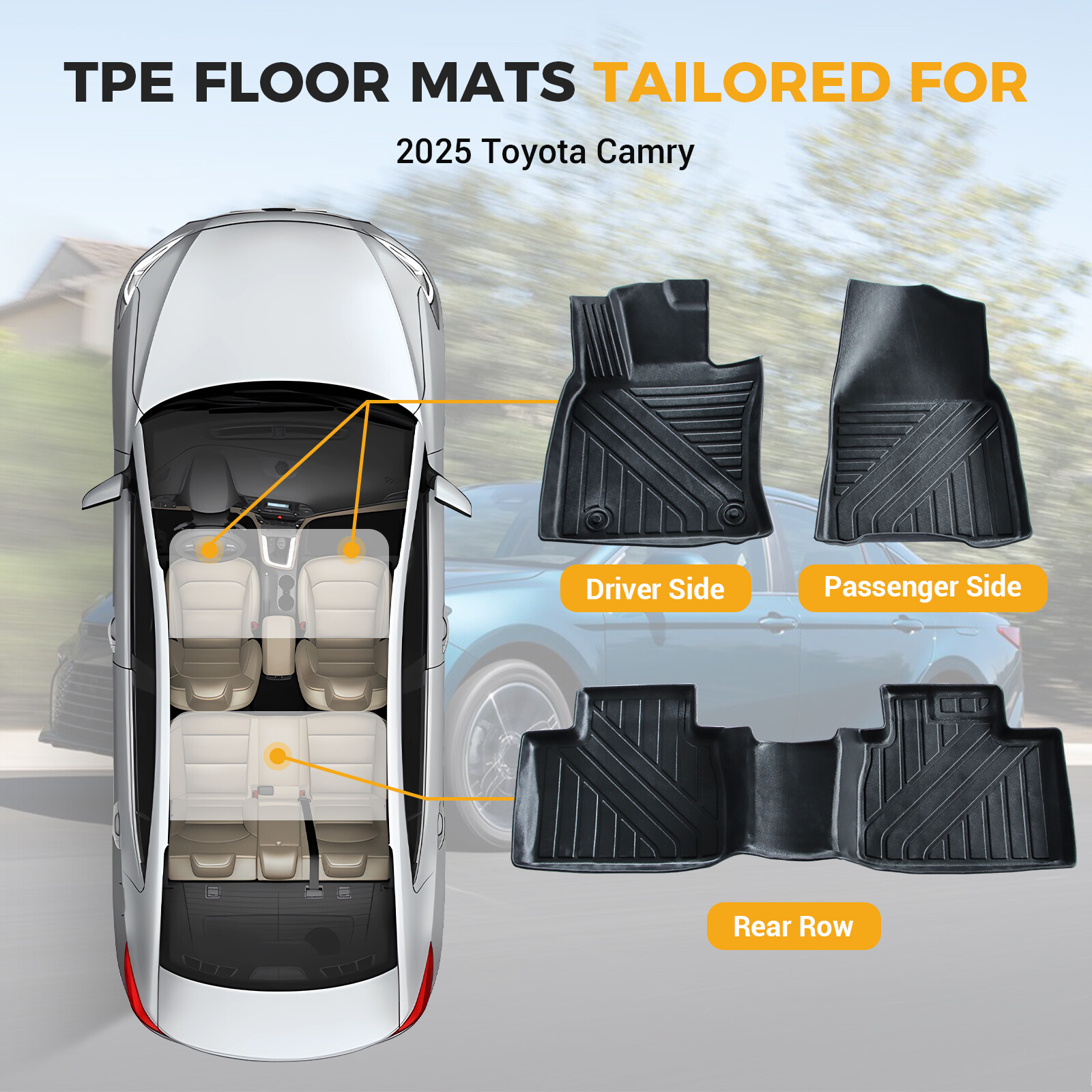 Fitment: 2025 Toyota Camry Package Include: 2×Front Floor Mats 1×Rear Floor Mat Features & Benefits : 1. Seamless Integration for Your Ride: Our premium floor mats are meticulously designed for a perfect fit with your vehicle, thanks to cutting-edge 3D digital laser scanning technology. This ensures that each mat contours to your car's floor with precision, providing a slip-resistant surface that enhances both safety and style. The advanced 3D border design seamlessly integrates with your vehicle's interior, making the mats appear as if they were part of the original design. 2.Superior Craftsmanship with TPE: Expertly constructed from top-grade Thermoplastic Elastomer (TPE), our mats are the epitome of durability and comfort. The TPE material is non-toxic, hypoallergenic, and free from odors, offering a safe and healthy environment for you and your passengers. Its exceptional strength, elasticity, and heat resistance make these mats a reliable choice, even in the face of summer's sweltering heat. 3.Eco-Friendly and Sustainable: Our commitment to the environment is evident in the choice of TPE material for our mats. These mats are not only highly durable, preventing wear and tear, but also eco-conscious. Made from recyclable materials, they contribute to a cleaner planet and support the sustainable use of resources. 4.Hassle-Free Maintenance: Cleaning our TPE mats is a breeze. They are impervious to water, oil, and dust, ensuring that your car's interior remains spotless. A quick wipe with a damp cloth or a thorough rinse is all it takes to keep them looking like new. Once cleaned, simply air dry in a well-ventilated space for a fresh start. 5.Your Satisfaction, Our Priority: We stand behind the quality of our products with a 3-month hassle-free return policy. If you face any issues or have concerns about the product's performance, don't hesitate to reach out. Our dedicated customer service team is on standby to address your queries within a 24-hour window, ensuring your complete satisfaction.